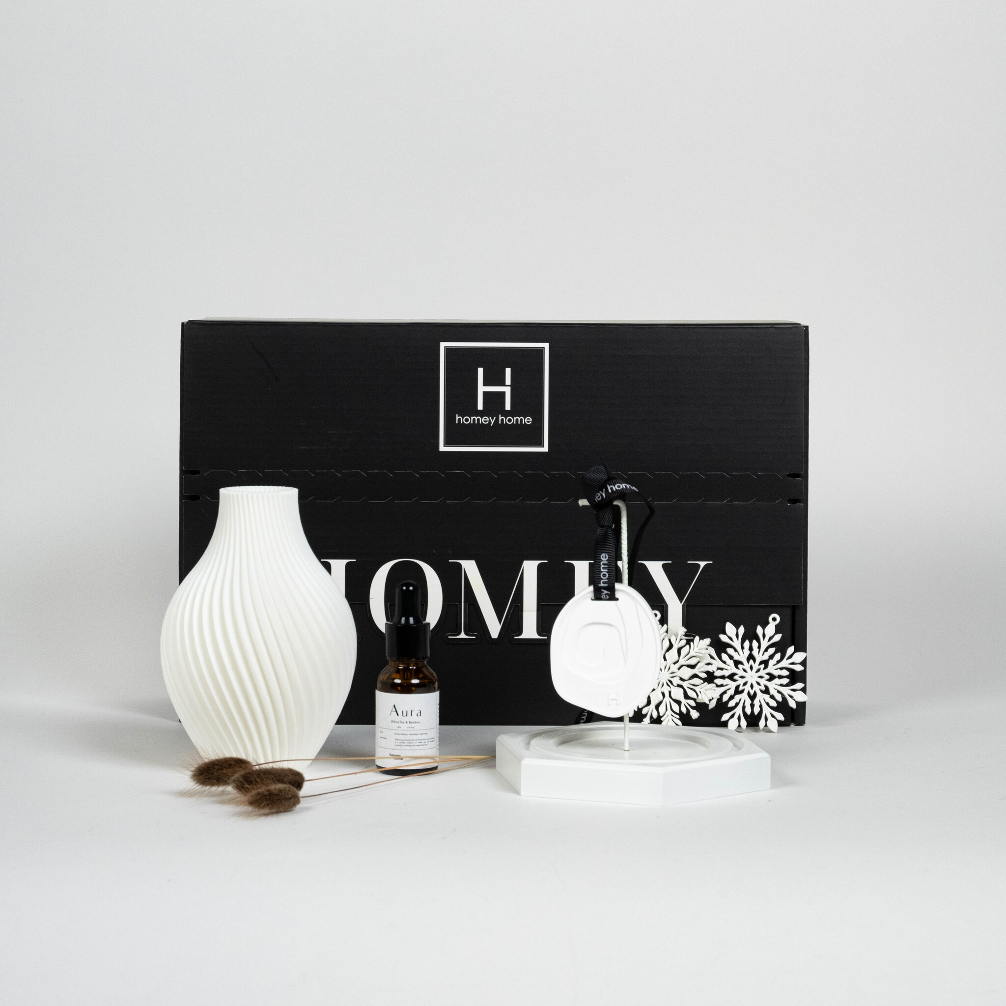 Introducing the 2025 XMAS HOMEY BOX – SPIRAL VASE & AURA SET & XMAS ORNAMENT (3DVA) — a holiday-exclusive gift box designed to elevate every corner of your home with warmth, beauty, and seasonal joy.