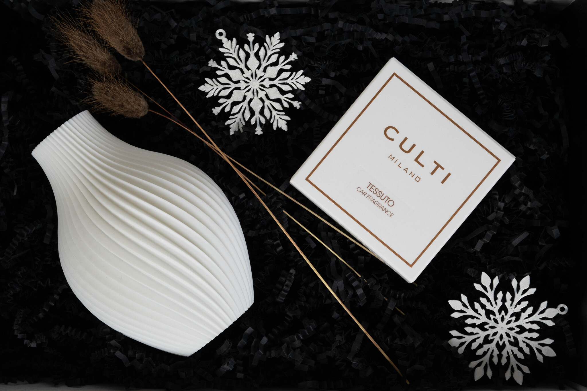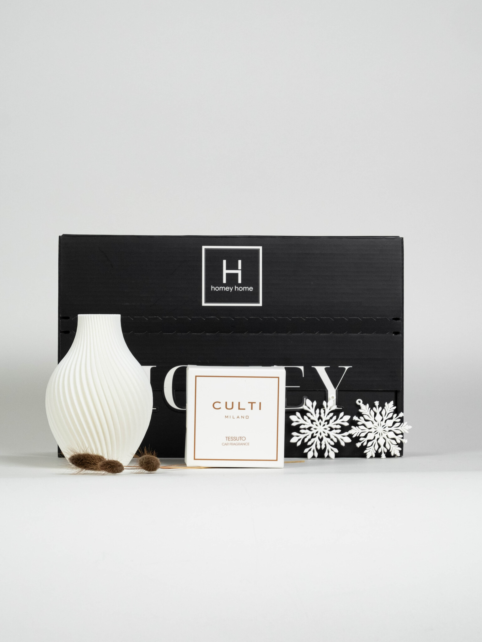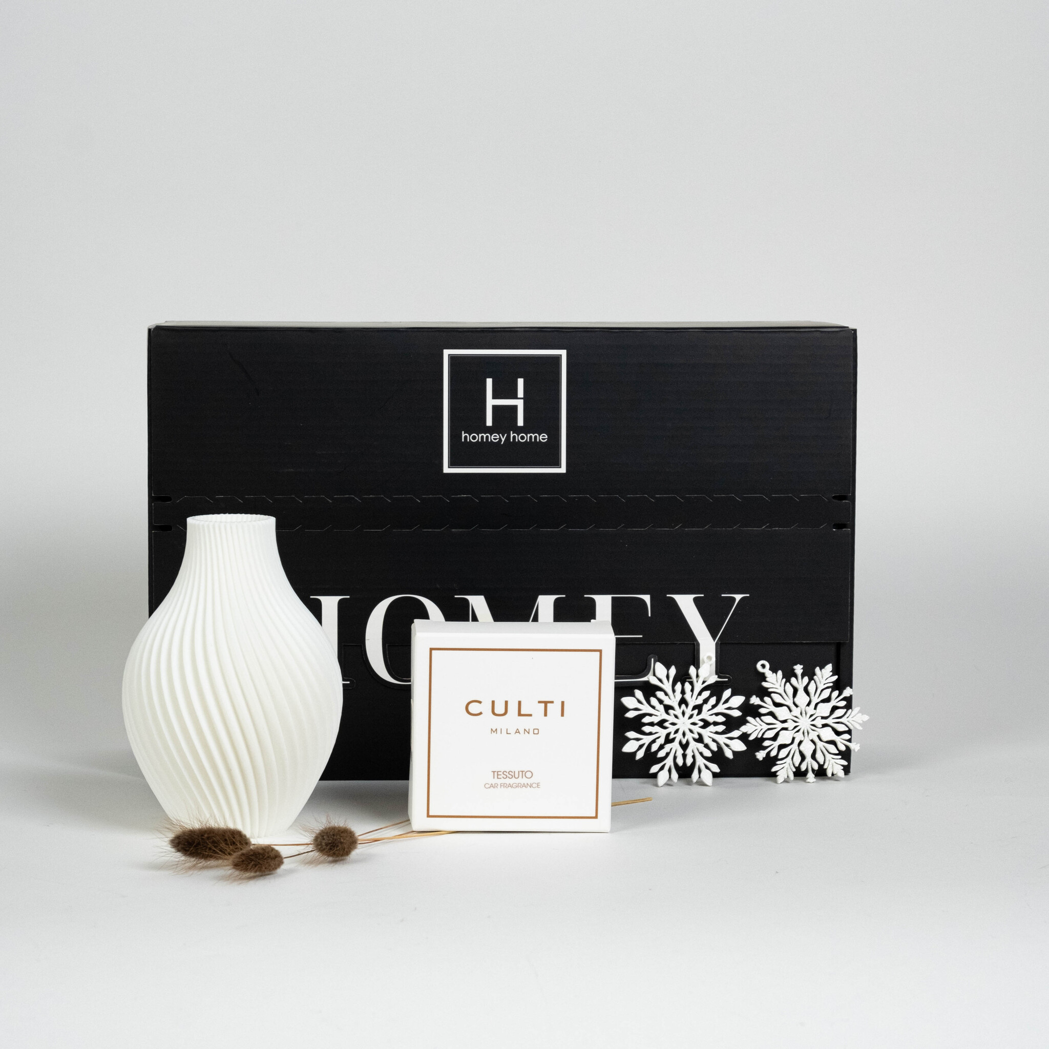 Bring festive warmth and joy into any home with the 2025 XMAS HOMEY BOX. This carefully curated gift set features a sculptural Spiral Vase, a Culti Car Sachet with a random seasonal fragrance, and an exclusive Xmas Ornament — beautifully packaged and ready for gifting.
