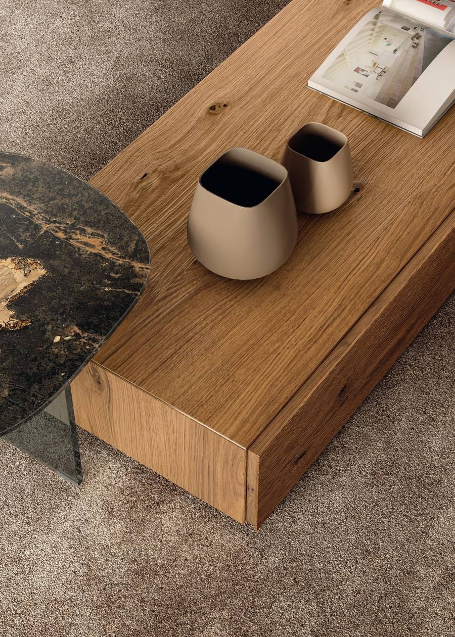 A perfectly formed storage unit with a 45° build and aluminium filigree: these are the defining features of this original floor-standing table for living room design offering practical storage space. The door has a delicate profile and is easy to open, preserving the product__ sleek design.