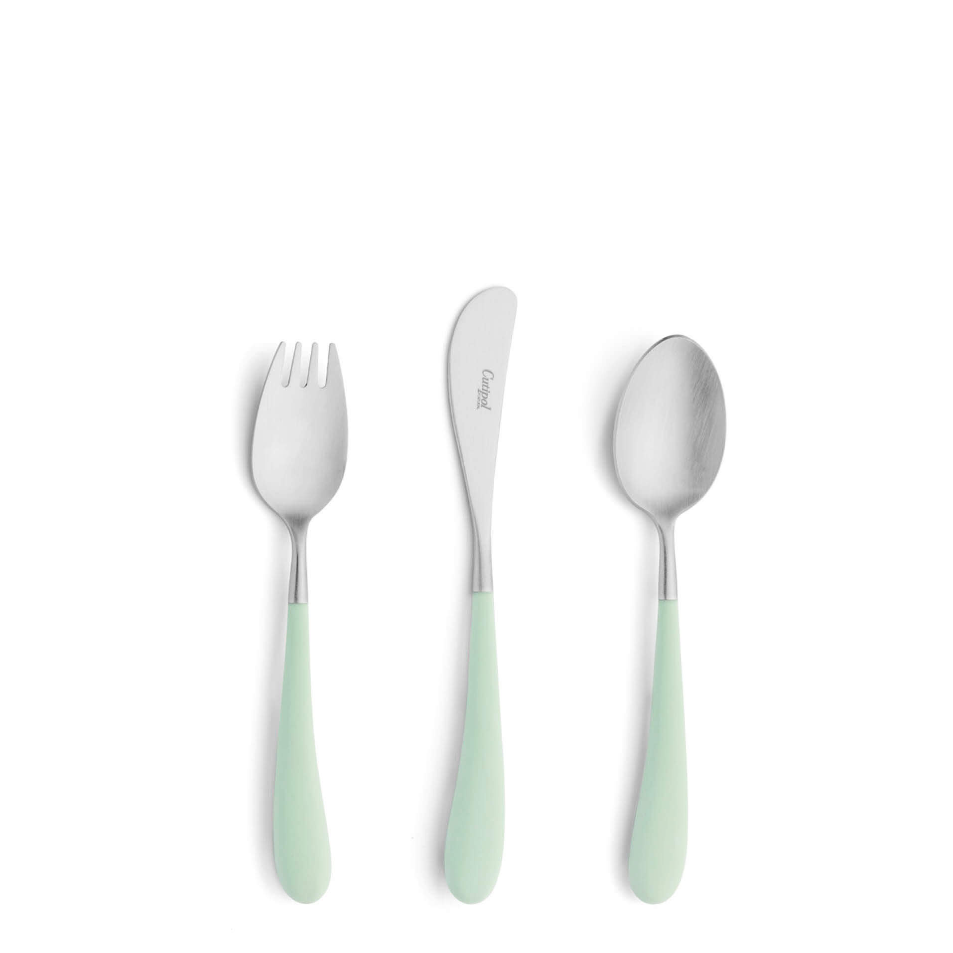 Designed for those who begin table rituals, Alice is the first step for not changing the fork in the left hand with the knife in the right. Subtly ergonomic set of 3 pieces, with a resin handle available in different colors and one wool case to store and carry the children's cutlery.