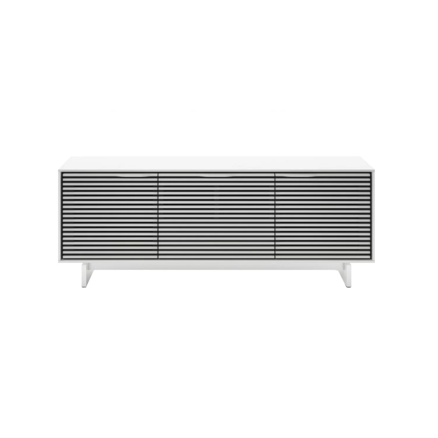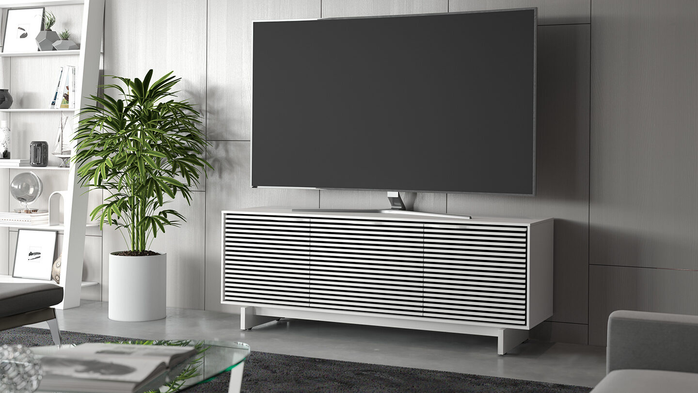 A modern console with a unique center drawer, a full-width soundbar shelf, and ample storage for movies, video games, and other media. Select from a Media base with wheels or taller Console base.