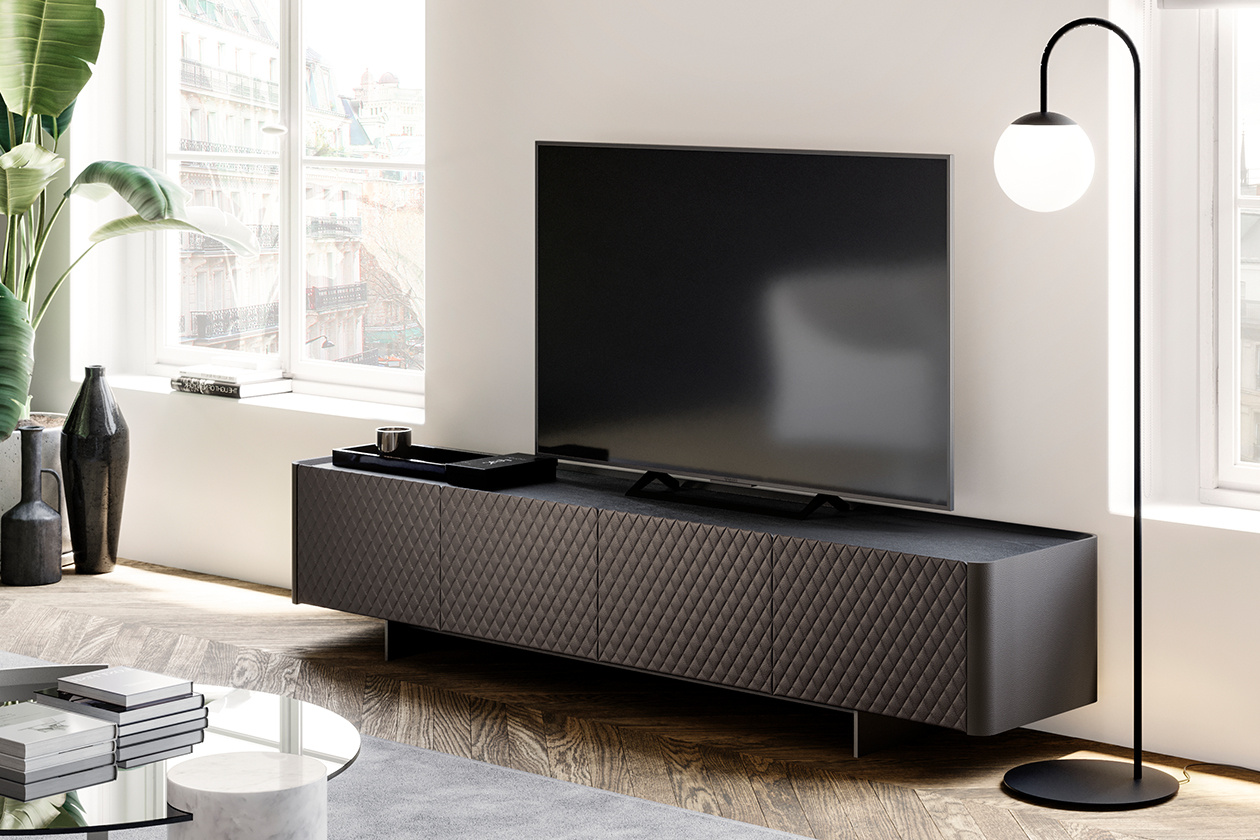 Alma TV Units Diamond is the designer TV stand that alone will be able to furnish and decorate the part of the living room dedicated to television with style. Taking inspiration from the storage unit, this designer TV stand is characterized by 4 quilted doors that embellish the furniture, the structure and doors are covered in leather, eco-leather or econabuk. The shelf can be made of veneered wood or ceramic, while the feet are in a refined black painted metal. In this elegant furnishing accessory we find soft and elegant shapes, expressed in the roundness of the corners with workmanship that enhances the high craftsmanship of the project. Alma TV Units Diamond is further enhanced when illuminated by the Decor floor lamp painted in black. Also available in the Alma TV Units and lacquered Alma TV Units versions.