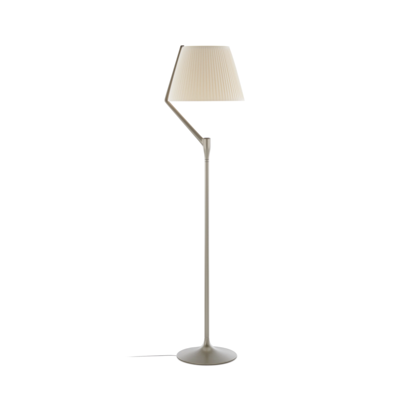 A light that is generously welcomed, reflected and given to the surrounding environment. Philippe Starck's lamp that revolutionises the light bulb/shade scheme: the source is not from above but from an LED positioned on the stem that illuminates the hat, from which high-tech lens reflections start. Thanks to the lampshade made from a single polycarbonate green mould, the light is reflected even more uniformly. ANGELO STONE is available floor version, in the three finishes champagne, copper and titanium.