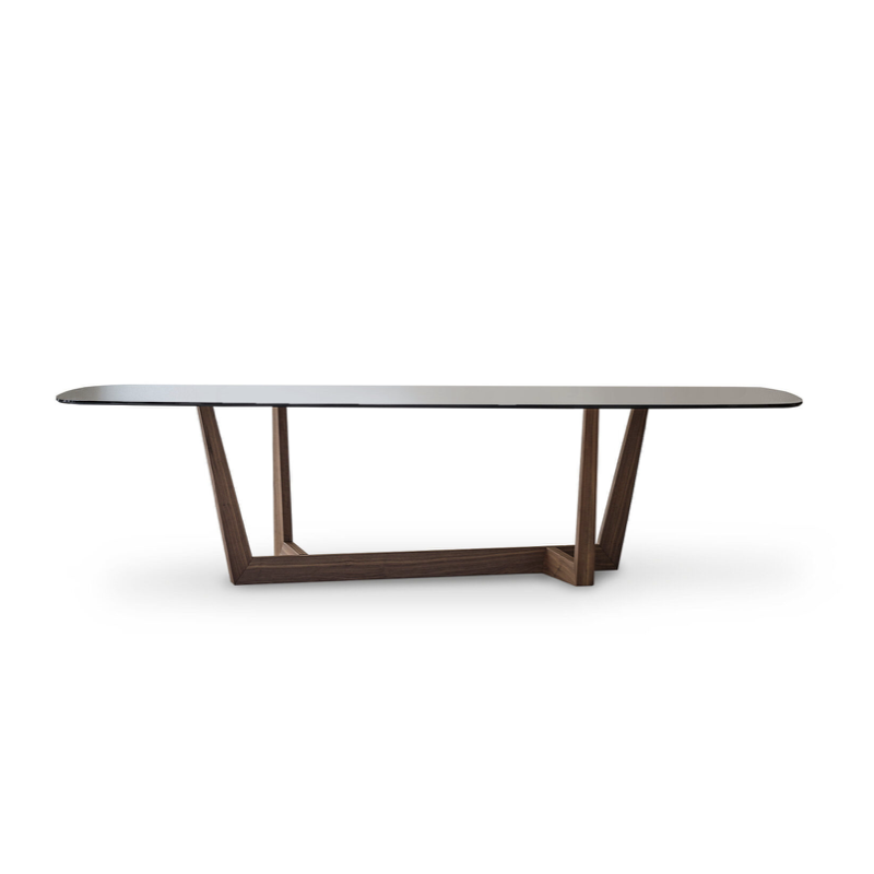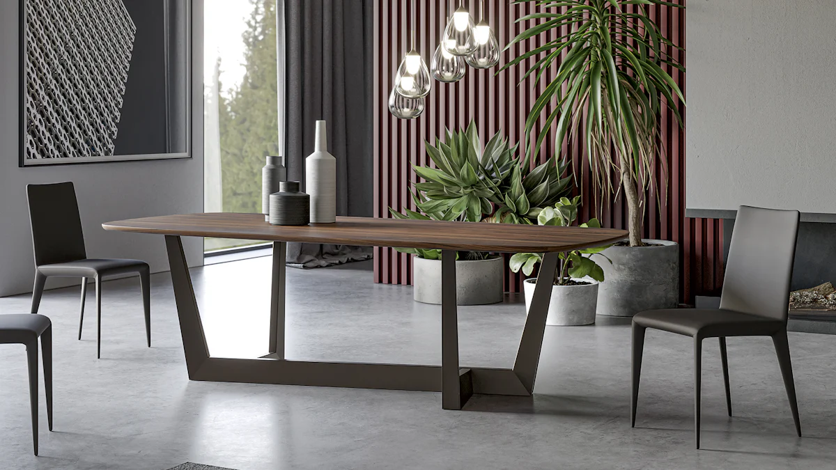 The base of the Art table is its most distinguishing feature: it is made of a metal trapezium that runs diagonally under the table top, allowing minimum obstruction and optimising the space. Overall, the load-bearing structure designed in this way stands out for its high levels of dynamism, solidity and sculptural impact. The top is firmly supported but the final effect is one of great lightness. The base of Art, a modern extendable table, is in painted metal of various colours; the table top in the fixed (rectangular, round or rectangular with rounded corners) or leaf version is available in different materials: this versatility makes it equally suitable for dining room or study. The Art table takes on new life in its version with a wooden base ("Art Wood").