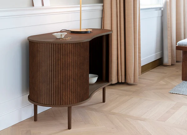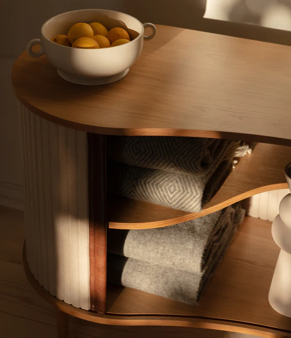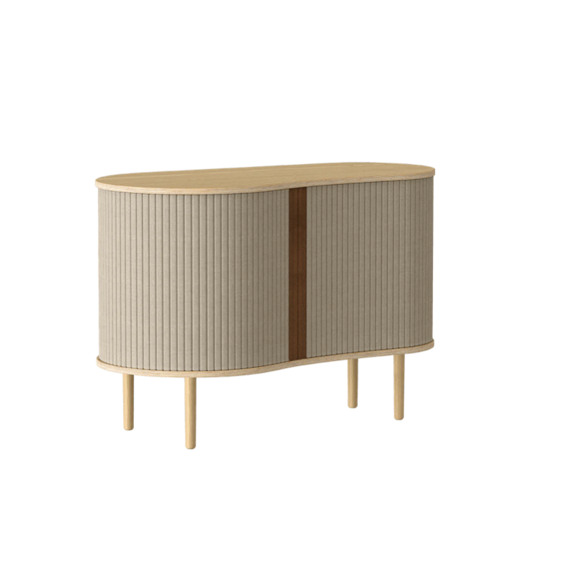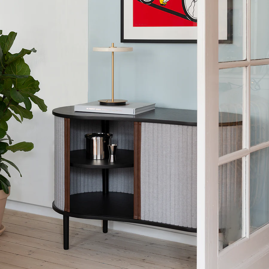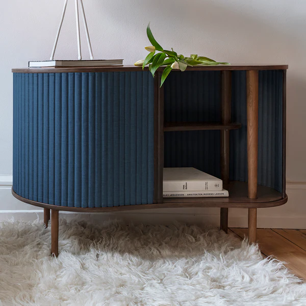 Audacious is a cabinet with personality designed as a place for displaying your favourite pieces. Its special tambour doors slide around the edge of the cabinet, letting you choose how much of the interior you want to put on show. Change the position of the sliding doors to create new displays and uses. Available in oak, dark oak and black oak with tambour doors in four carefully selected colours of the 100% recycled Horizons textile. The tambour doors are interchangeable, meaning that you can change them easily yourself and add new life to the design without having to buy an entirely new furniture piece, saving the world resources