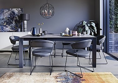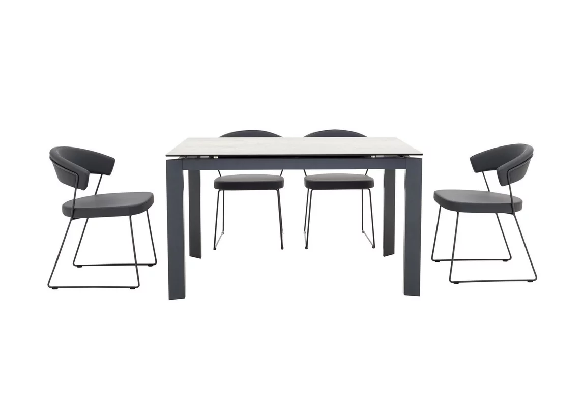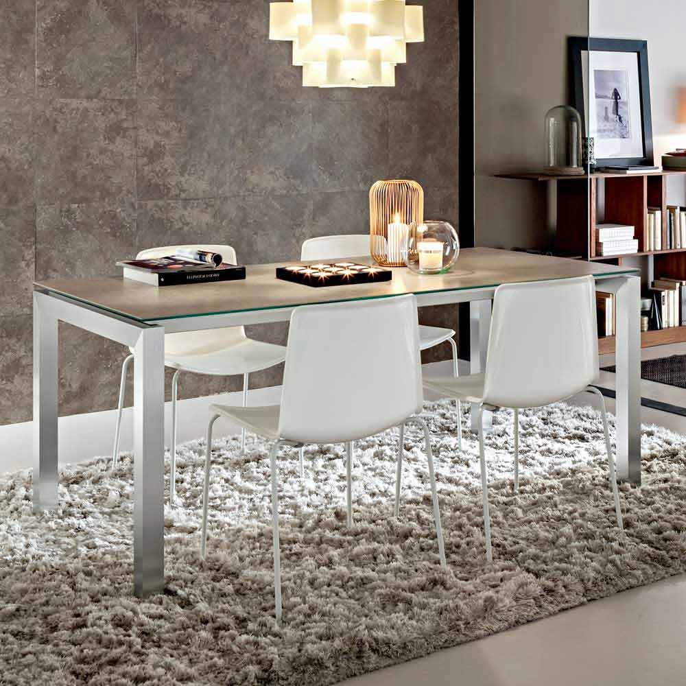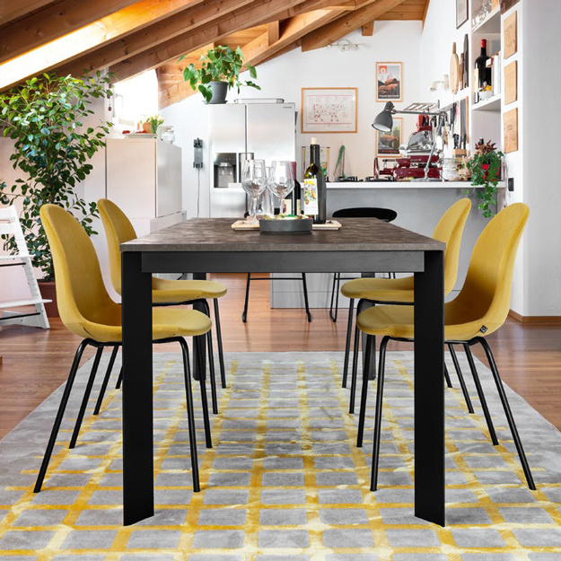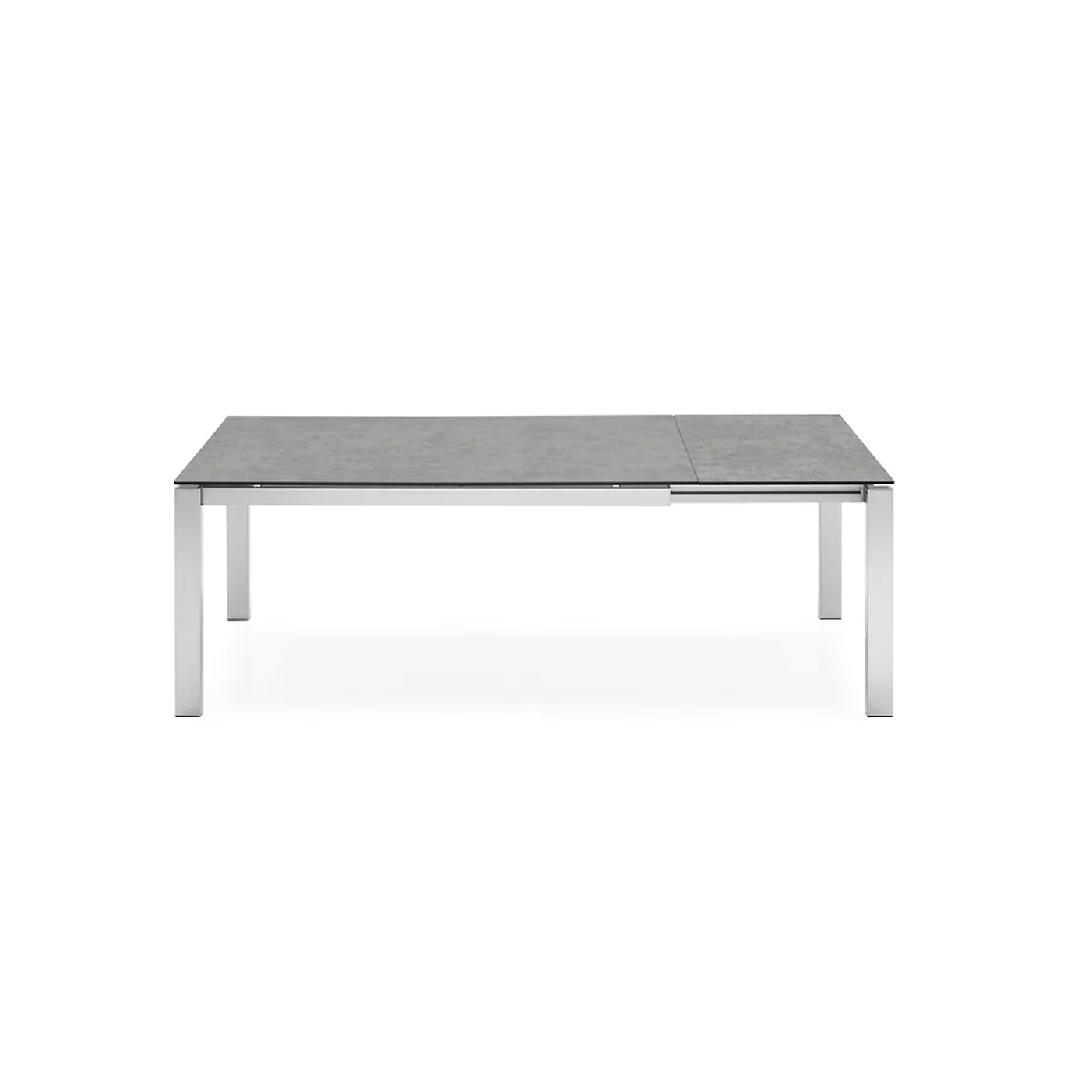 Baron extendable table by Connubia with rectangular top with a choice of various finishes and metal structure with perimeter legs. The Baron table contains a practical mechanism capable of increasing the support surface. By pulling the structure towards you, the two legs equipped with hidden wheels slide on one side allowing you to extract the extension. With a simple rotation movement, the extension mounted on metal tracks comes out of its housing and aligns with the top. The triangular or rectangular legs of your choice always remain at the perimeter ensuring maximum comfort for all guests.