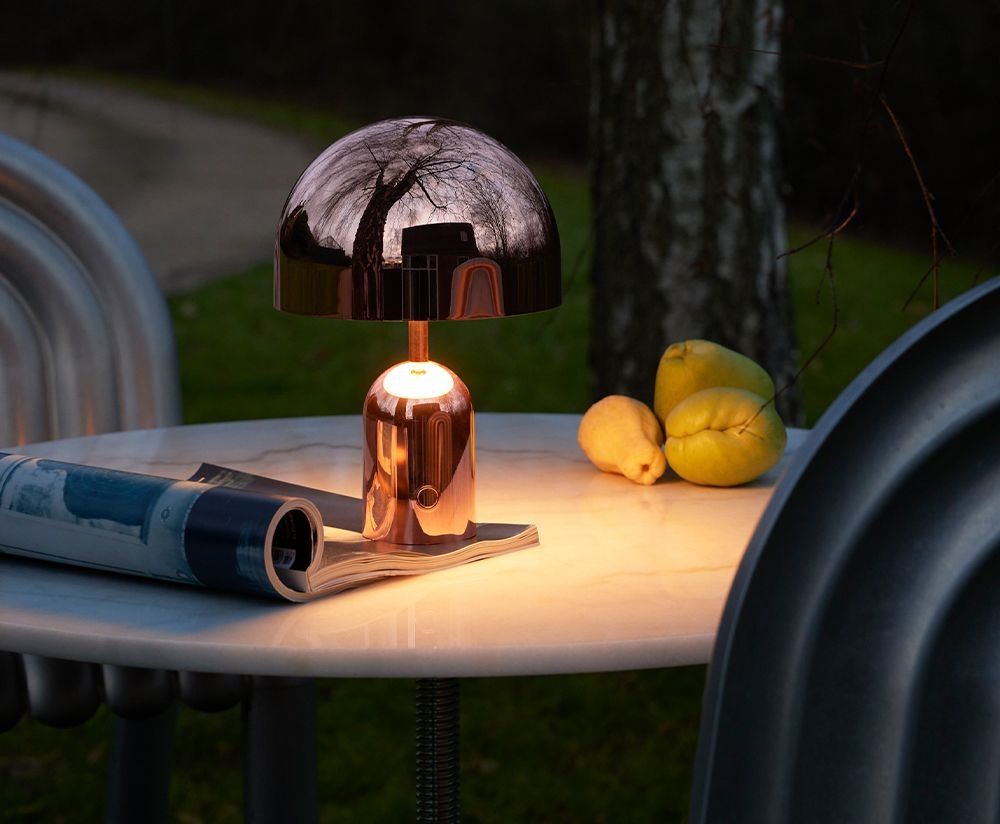 Taking its name from a classic dome shape, Bell is an exercise in reductionism. The hyper-polished surface allows Bell to take on the tone and characteristics of its surroundings while a concealed diffuser produces its soft lighting. Bell Portable LED offers up to 9 hours of battery life.
