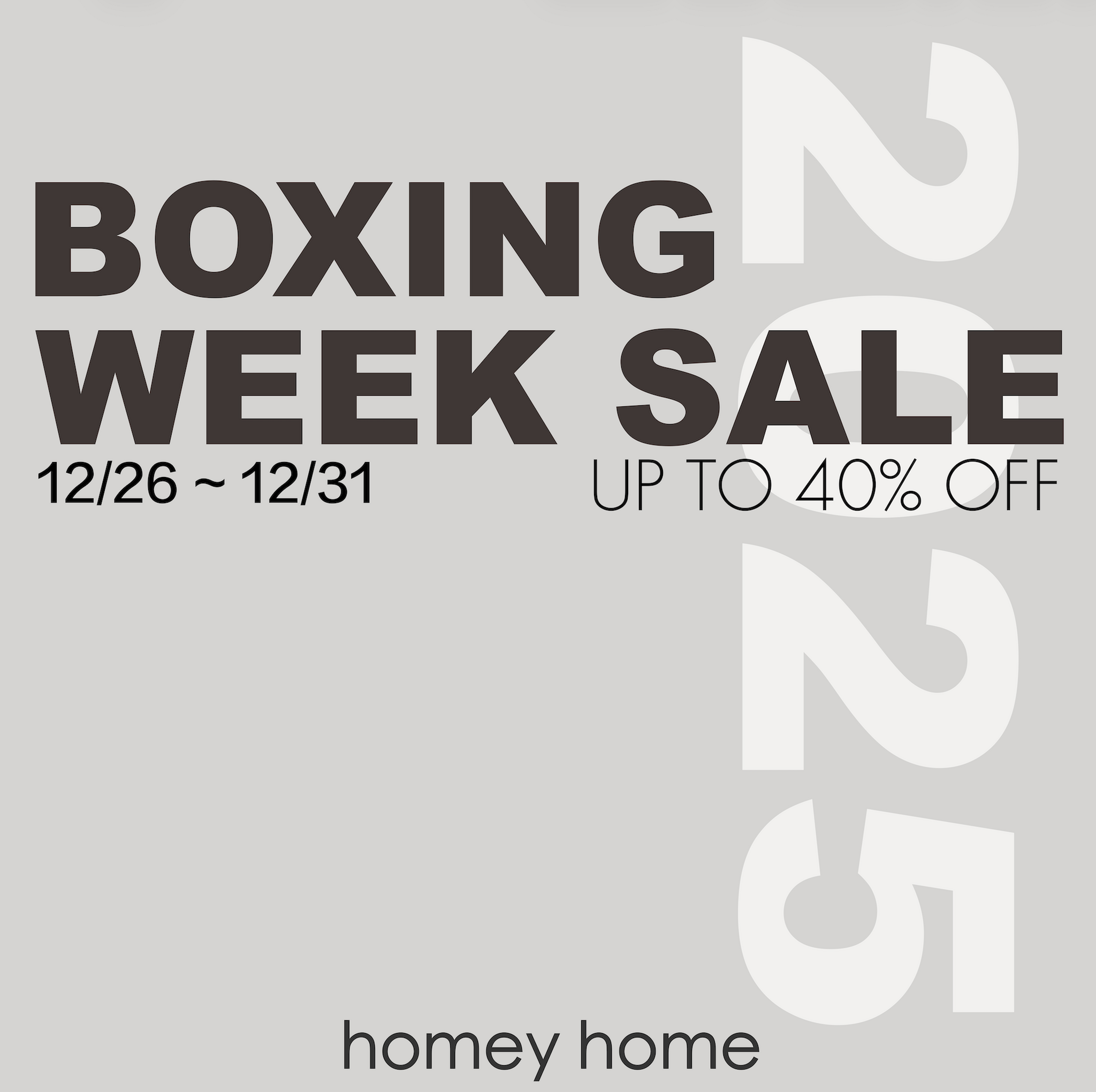 From Dec 26 to 31, enjoy 20% off all furniture and up to 40% off final clearance items. Limited stock. In-store only at Homey Home Interiors.