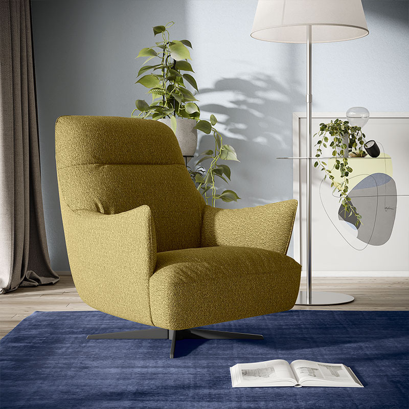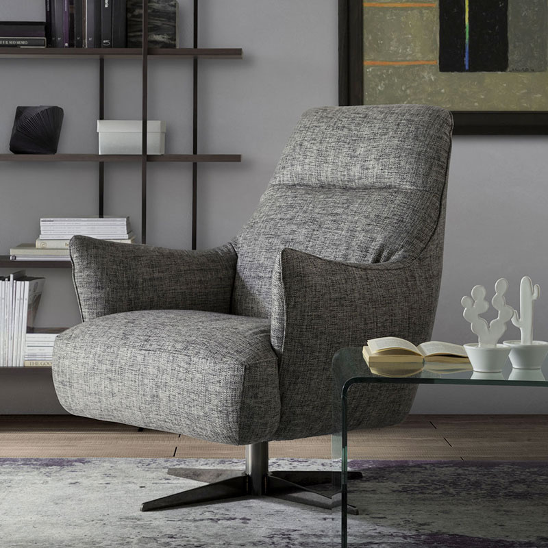 This armchair packs a real punch thanks to its unique design, which combines a generous seat with a backrest to create a feel of calm and comfort. A practical swivel base facilitates movement and helps the piece adapt to any user need. This sleek Natuzzi Editions armchair is the perfect addition to any living area.