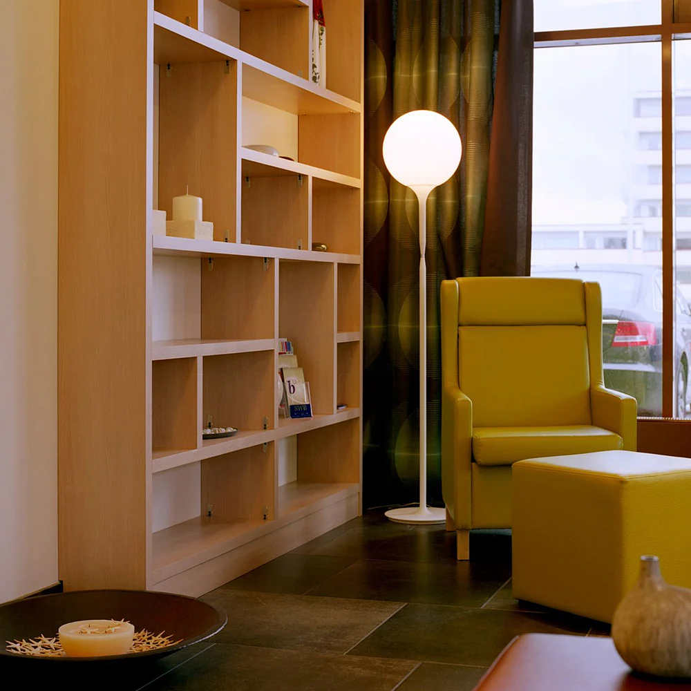 A spherical-shaped diffuser hand-blown in opaque white glass is enhanced by a removable tapering stem which emits a soft glow. The stem is made of steel with tubing covered in polycarbonate sleeve.