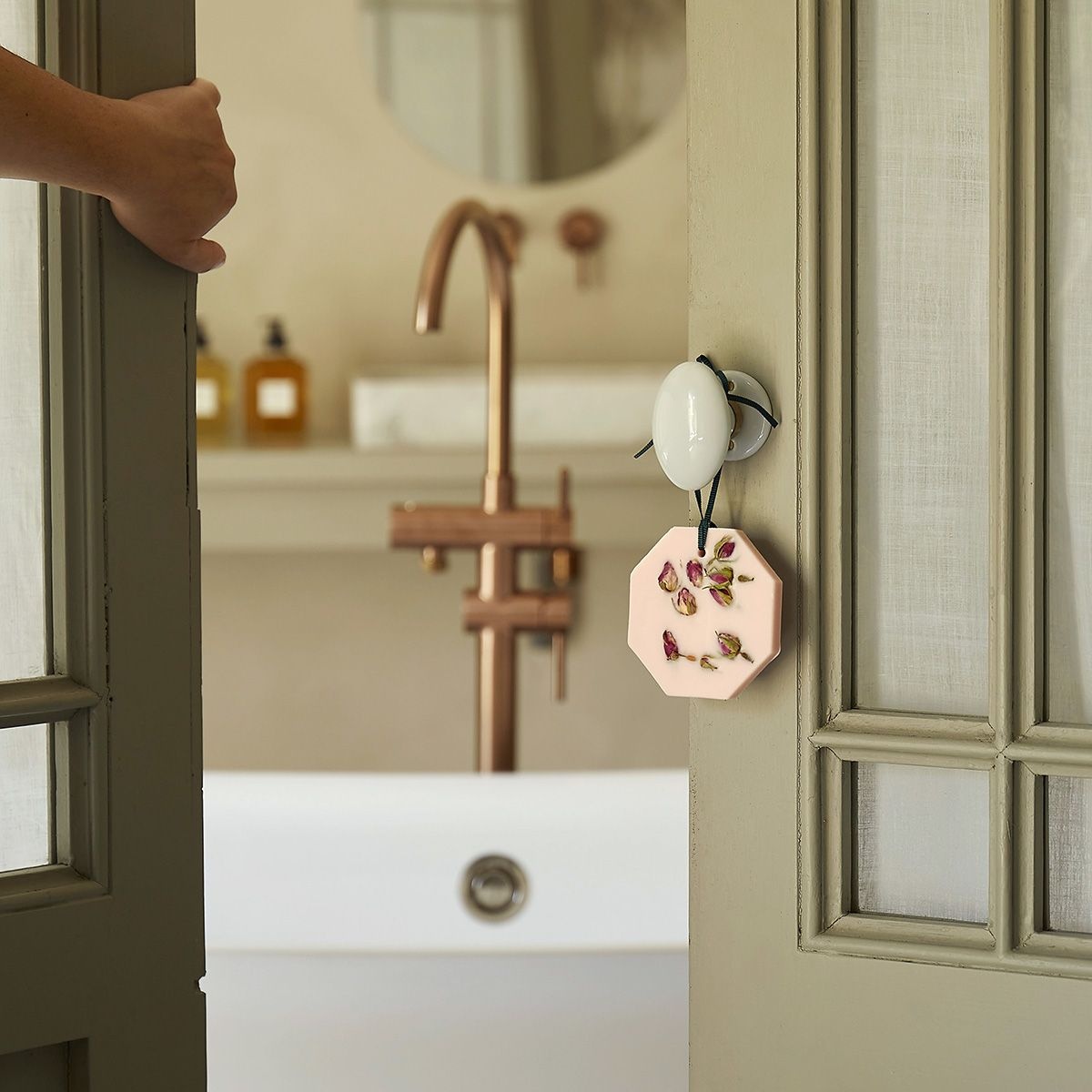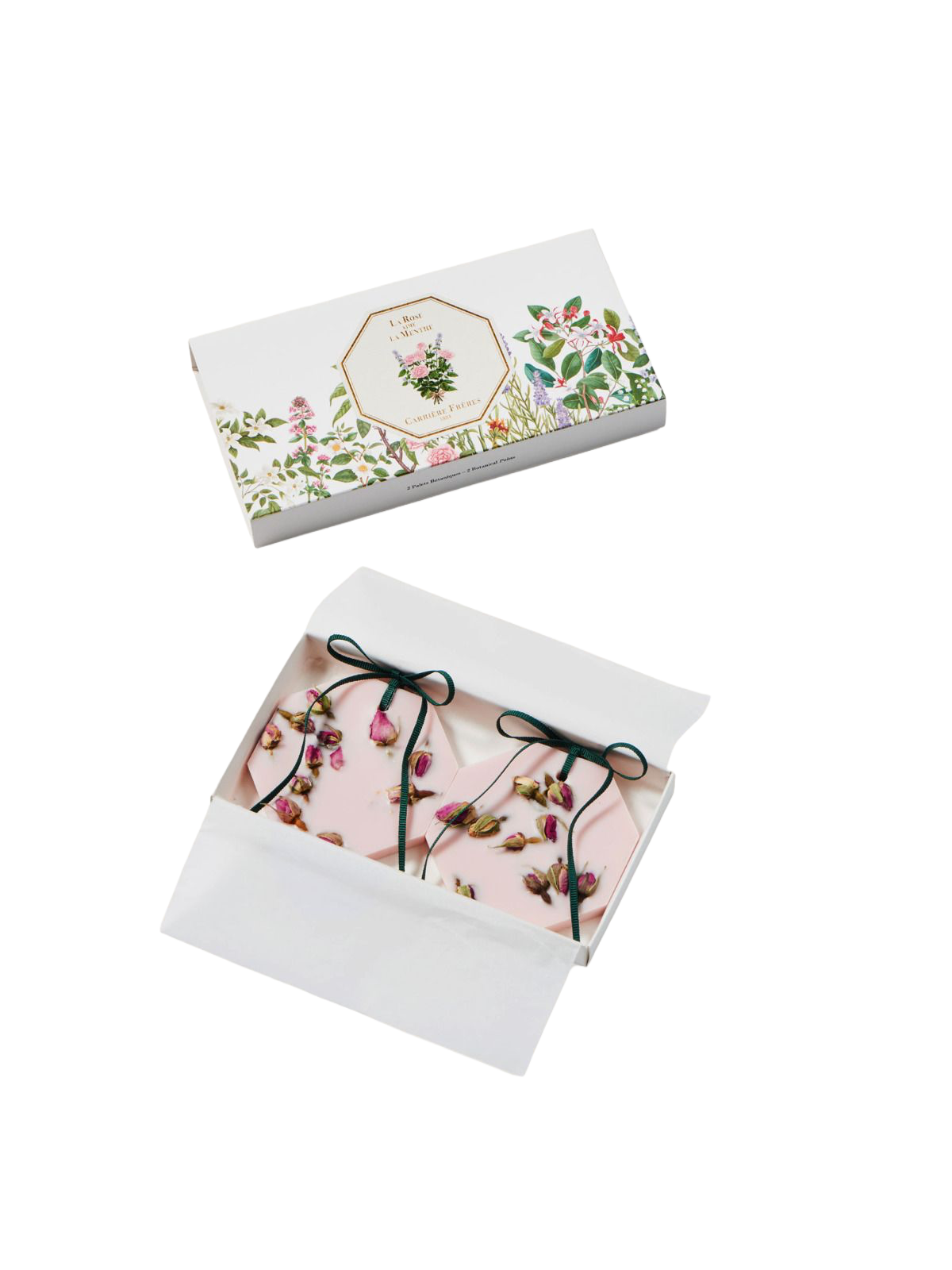 Discovered in Turkey, the rose proudly exhibits its exquisite corolla of petals in order to reveal the finesse of its scent. By contrast, spearmint offers freshness with its deep green serrated leaves and cob-shaped pink or lilac flowers. Characteristic from North Africa's souk markets and palaces, it stands out with its exhilarating and subtle scent.