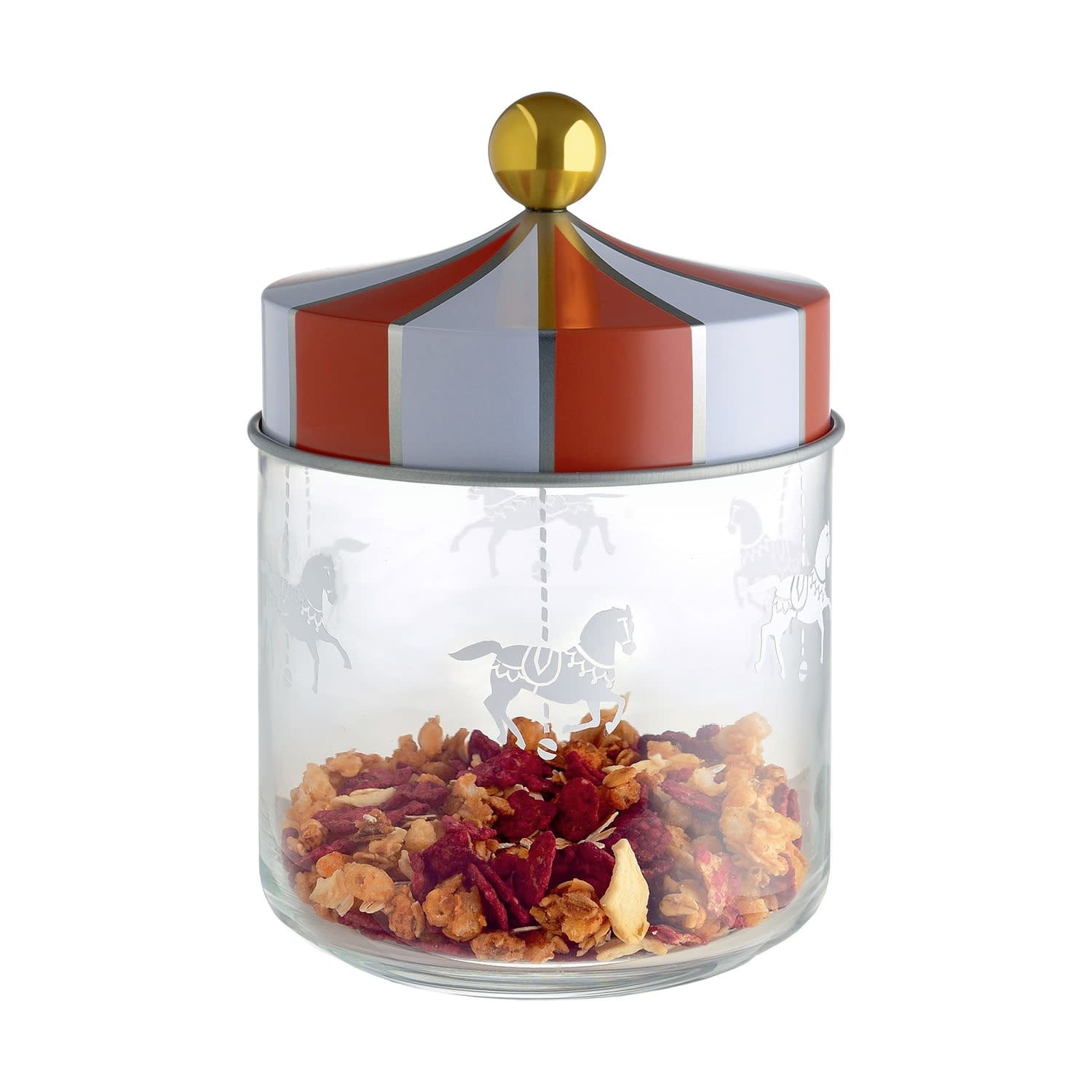 The Alessi Circus series jars with hermetic lids can be used to store various food items, locking in all their freshness, aroma and flavour. For these objects, Marcel Wanders imagines a decoration reminiscent of the merry-go-rounds often set up along with the circus big top. The lid is decorated with the traditional red and white stripes of fairground ride awnings, while the gold-coloured knob conjures up the ornamental element that adorns the centre. The result is enchanting: Wanders transforms classic kitchen jars into cheerful mini fairground rides.