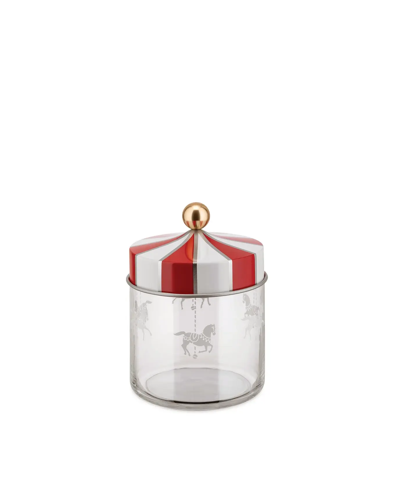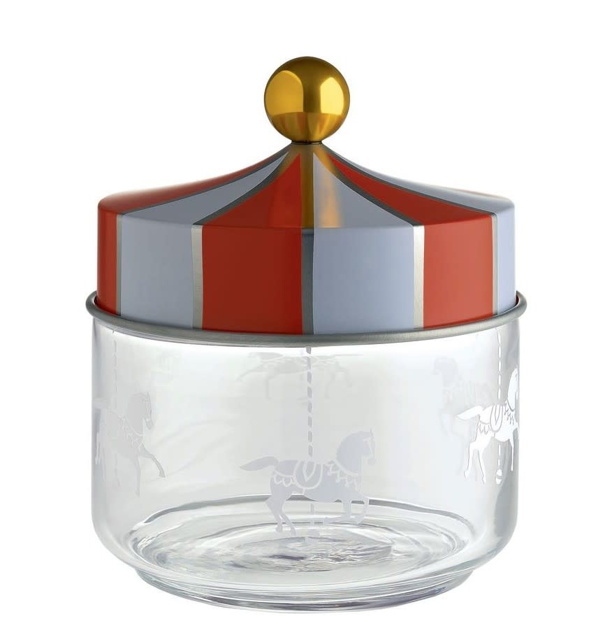 The Alessi Circus series jars with hermetic lids can be used to store various food items, locking in all their freshness, aroma and flavour. For these objects, Marcel Wanders imagines a decoration reminiscent of the merry-go-rounds often set up along with the circus big top. The lid is decorated with the traditional red and white stripes of fairground ride awnings, while the gold-coloured knob conjures up the ornamental element that adorns the centre. The result is enchanting: Wanders transforms classic kitchen jars into cheerful mini fairground rides.