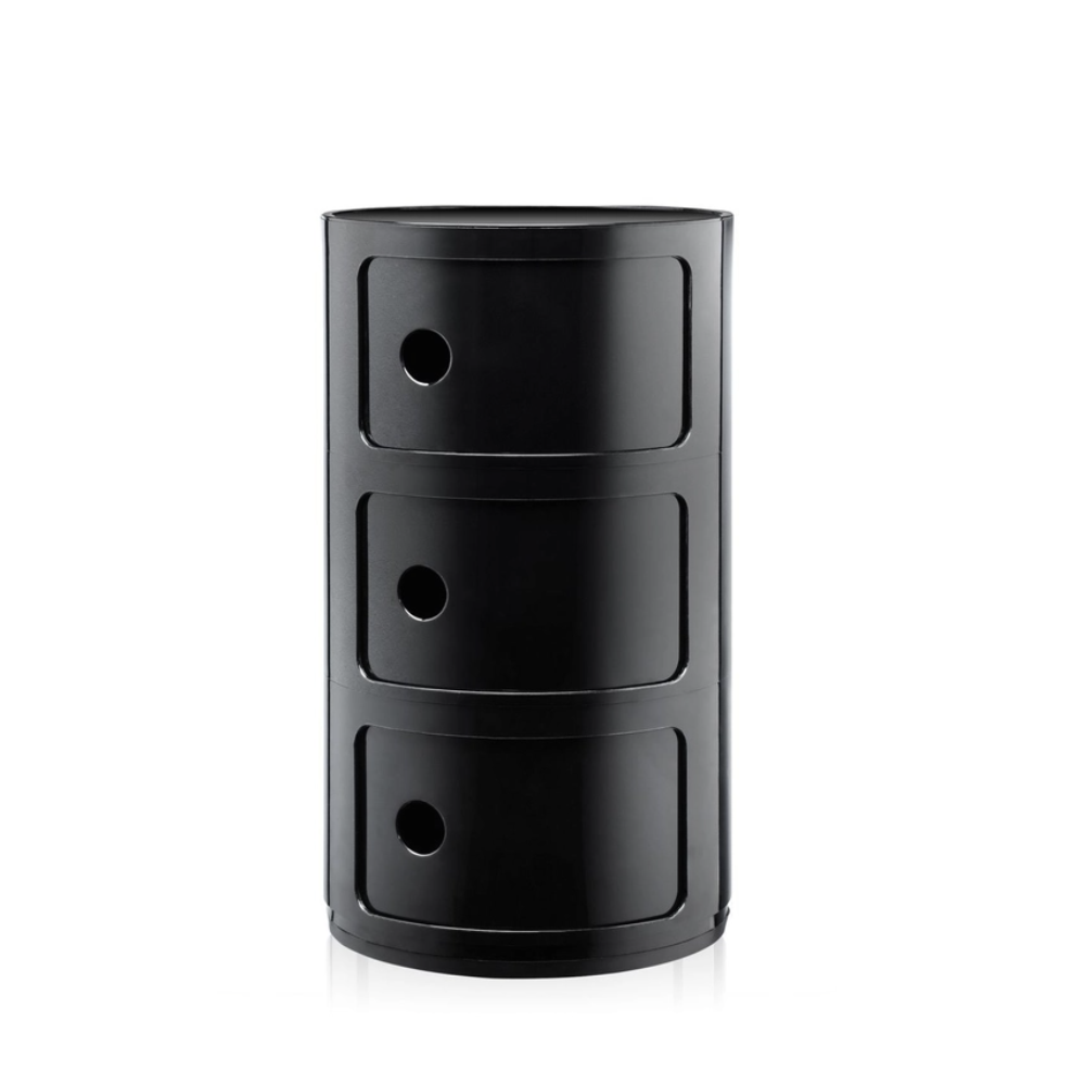 The modular elements were designed to meet different needs and to fit perfectly into every room in the home. Componibili first appeared in 1967 and have become a timeless furnishing classic. Today’s Componibili are 32 cm in diameter. Thanks to fixed compositions of two, three or four elements, these products are both functional and practical in all environments. This model comes in six glossy finishes and one matte silver finish.