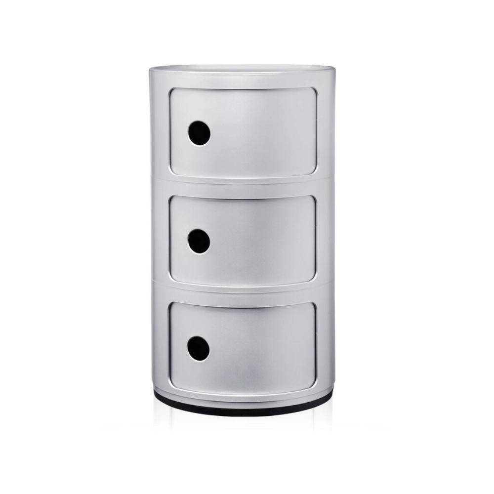 The modular elements were designed to meet different needs and to fit perfectly into every room in the home. Componibili first appeared in 1967 and have become a timeless furnishing classic. Today’s Componibili are 32 cm in diameter. Thanks to fixed compositions of two, three or four elements, these products are both functional and practical in all environments. This model comes in six glossy finishes and one matte silver finish.
