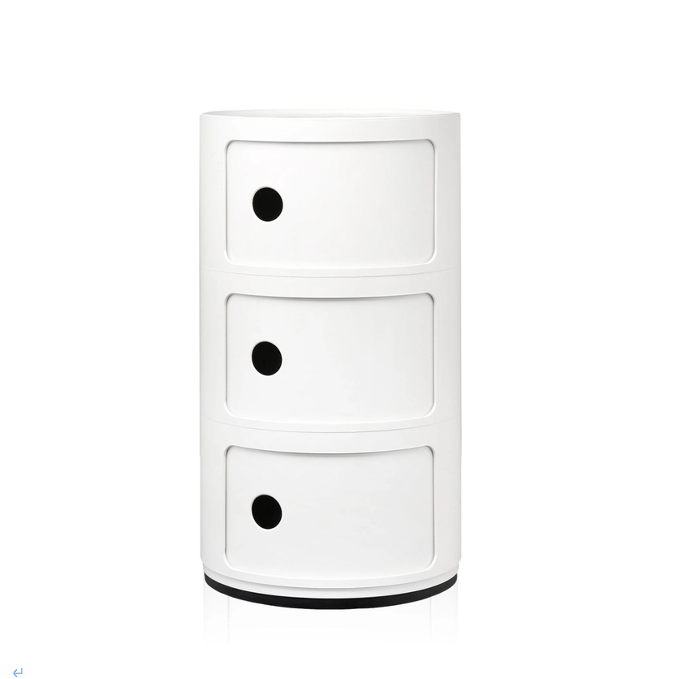 The modular elements were designed to meet different needs and to fit perfectly into every room in the home. Componibili first appeared in 1967 and have become a timeless furnishing classic. Today’s Componibili are 32 cm in diameter. Thanks to fixed compositions of two, three or four elements, these products are both functional and practical in all environments. This model comes in six glossy finishes and one matte silver finish.