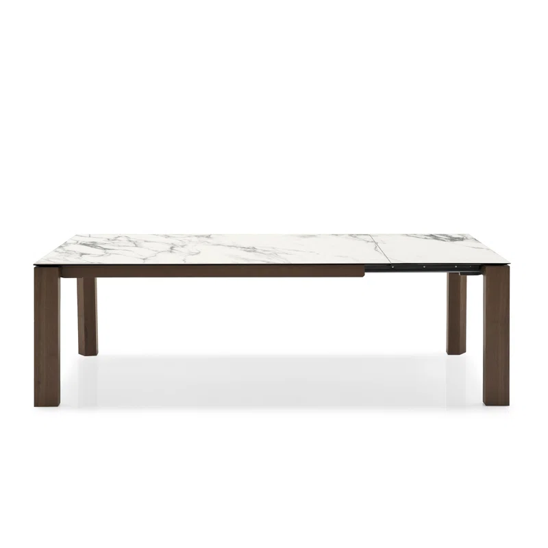 Omnia is a 12-seat extendable dining table featuring wooden legs and a ceramic-stone top. It is a functional rectangular table that owes its distinctive look to the top which appears to be suspended above the wooden frame. The legs, always remaining at the corners, extend on one side, allowing you to lift the extension leaf into place with a rotational movement.