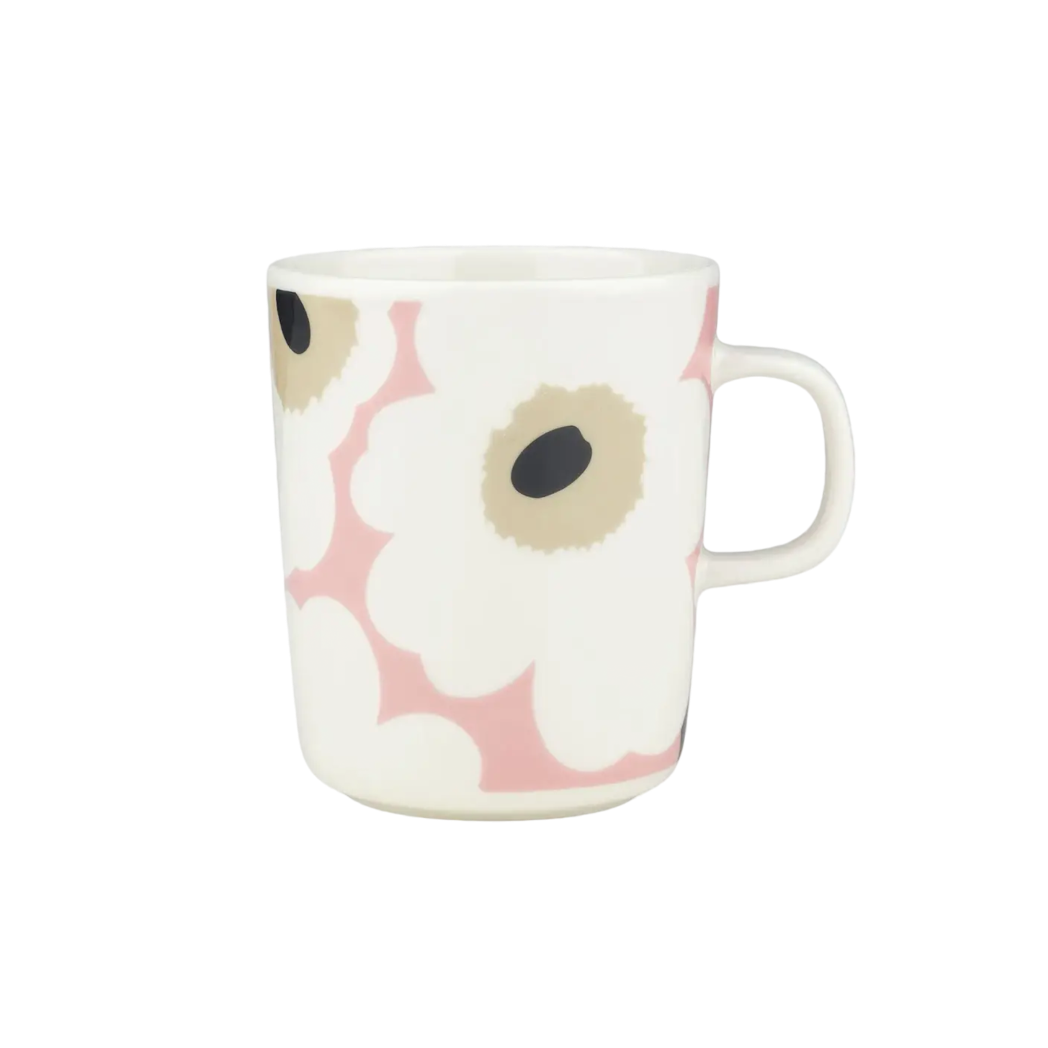 The Oiva mug with Unikko pattern is made of white stoneware that is dishwasher, oven, microwave and freezer proof.