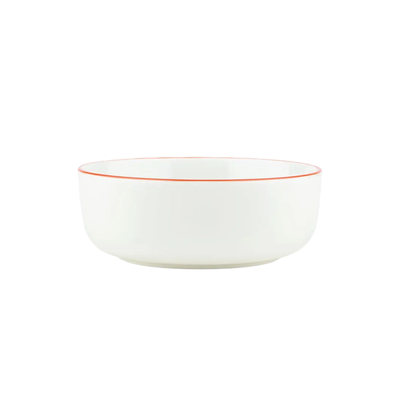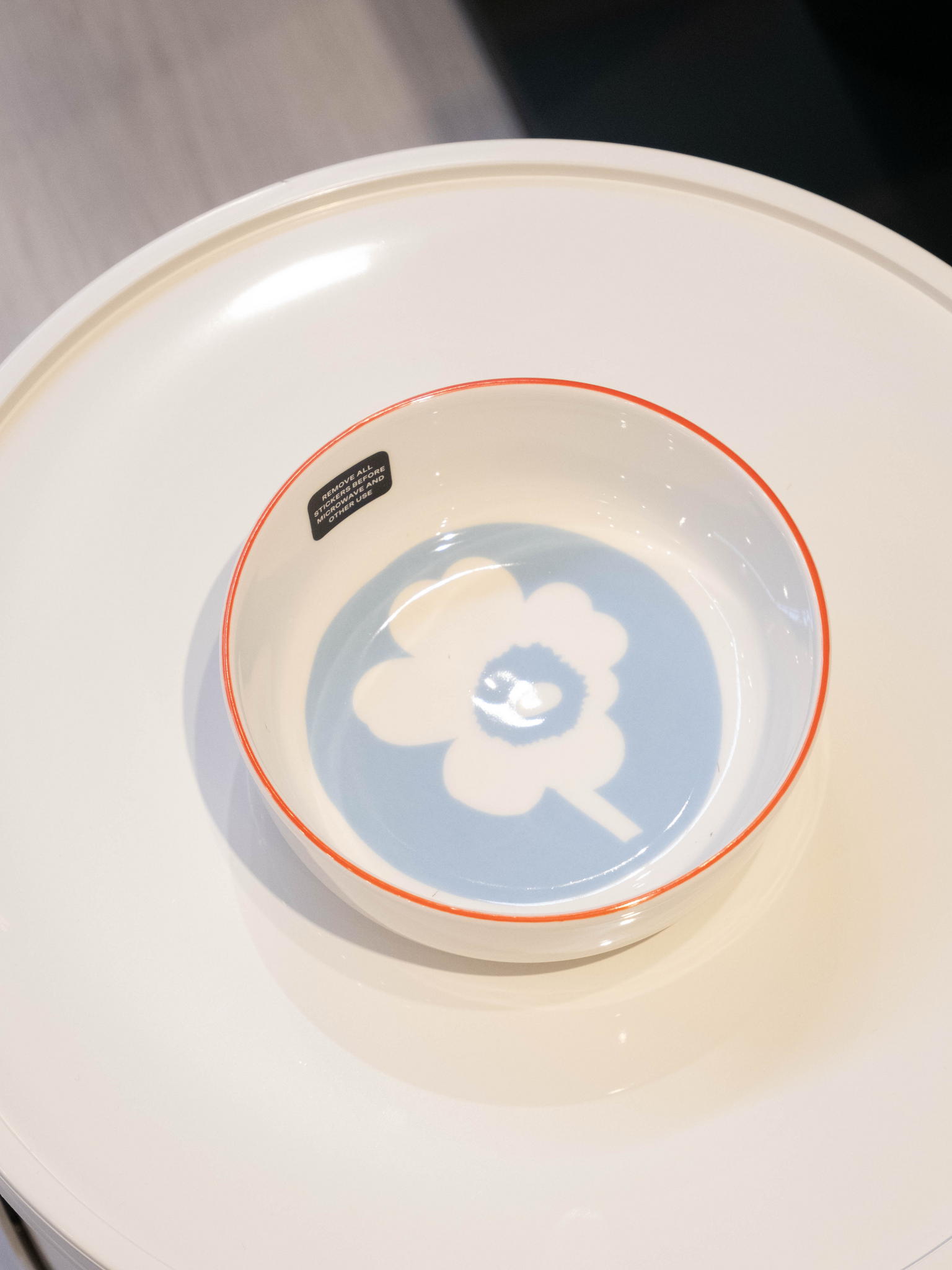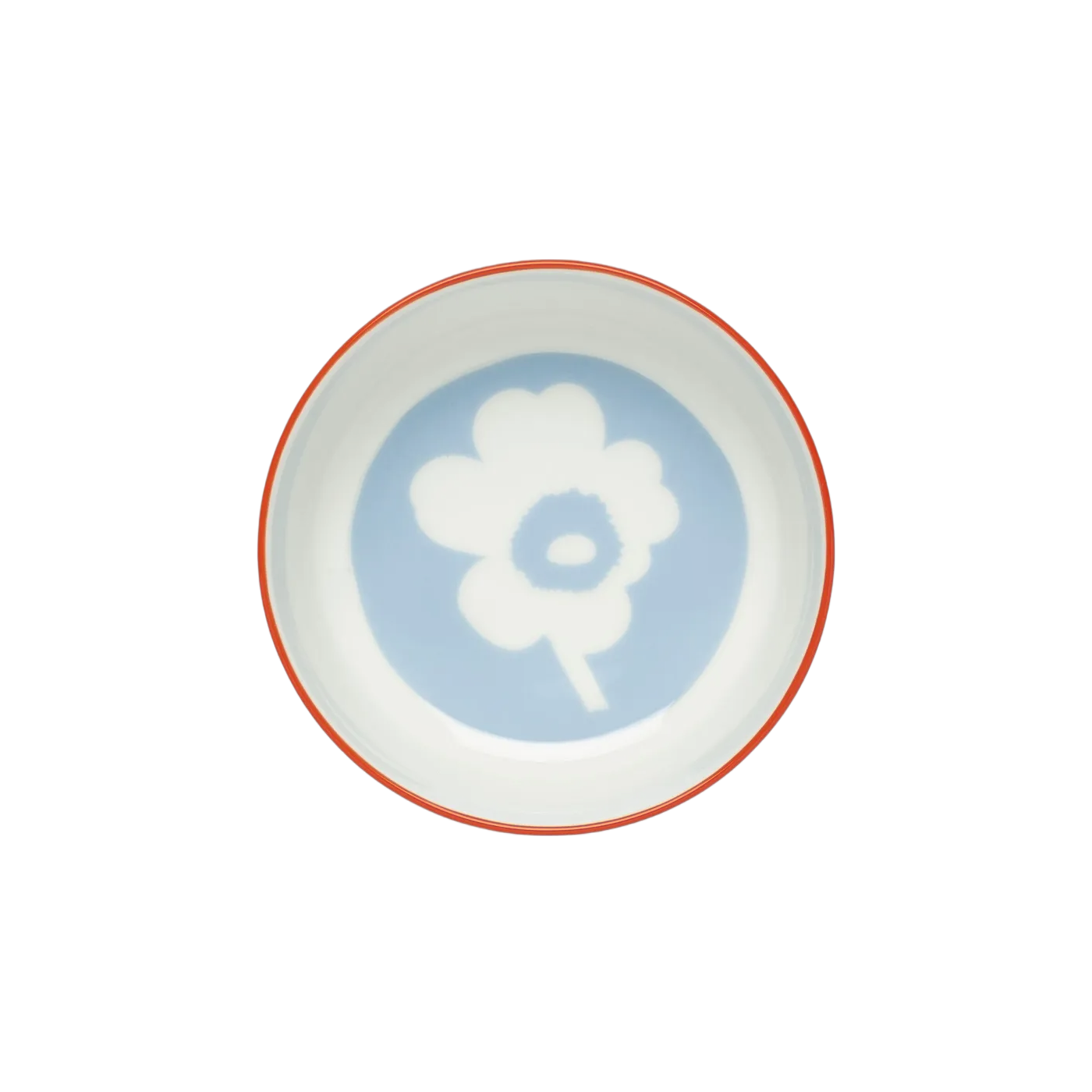 The Oiva bowl features the Unikko pattern flower and an orange, hand painted rim. The bowl is dishwasher, oven, microwave, and freezer safe.