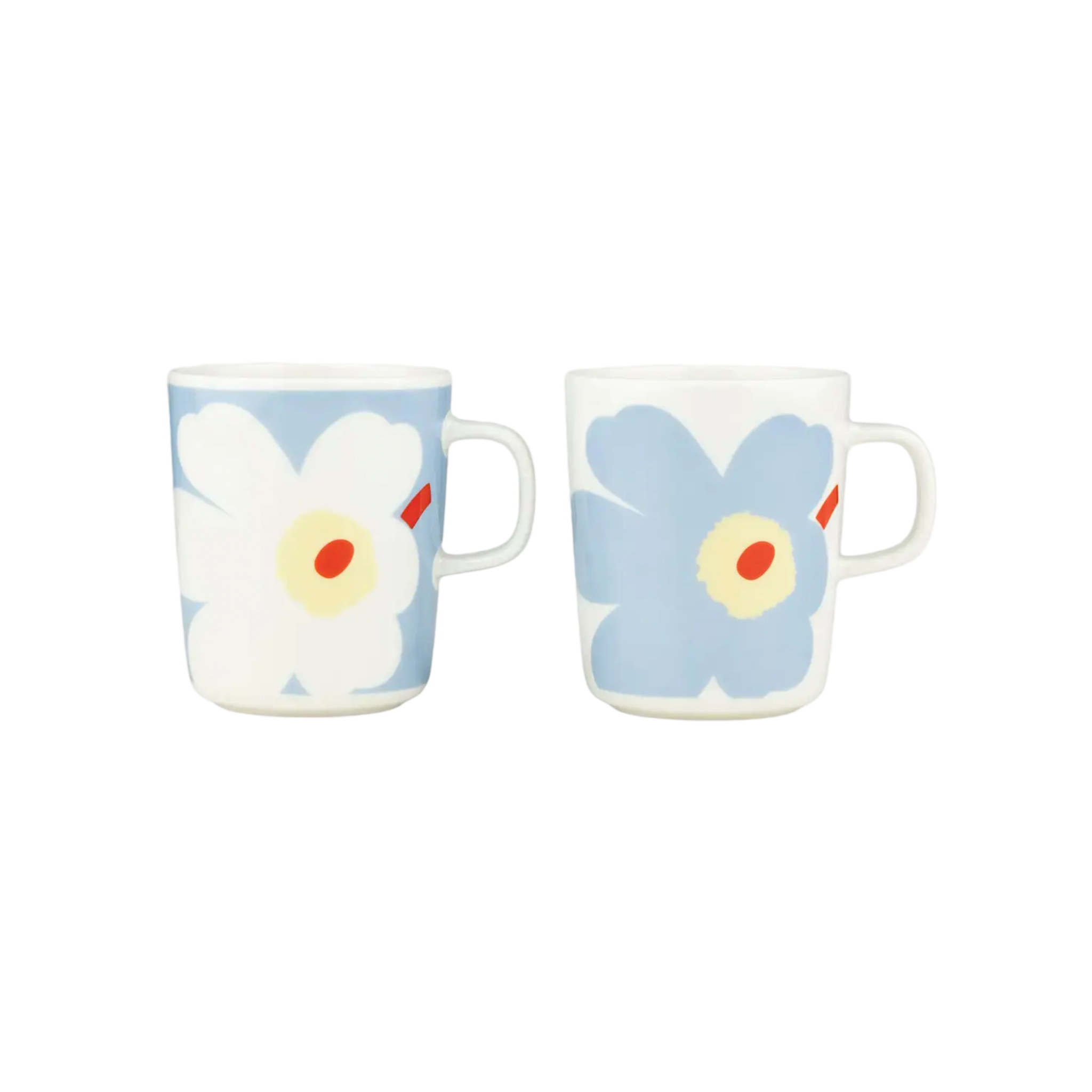 This set includes two 2,5 dl Oiva mugs. The different colored mugs feature the Juhla Unikko pattern. The mugs are dishwasher, oven, microwave, and freezer safe.