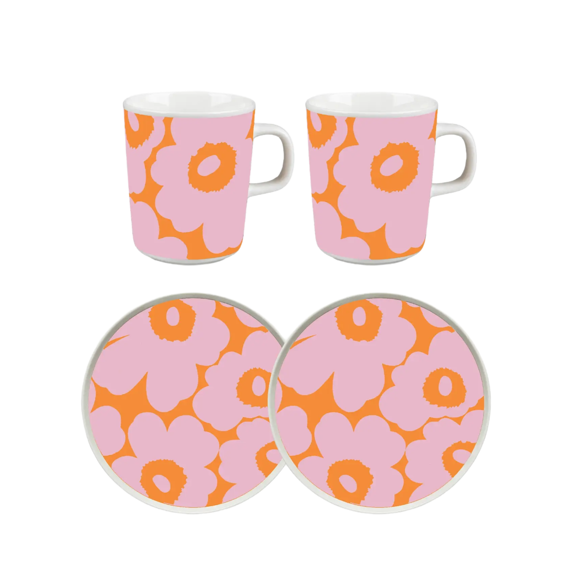 The Unikko pattern Oiva breakfast set includes two 2,5 dl mugs and two 20 cm plates. The products are dishwasher, oven, microwave, and freezer safe.