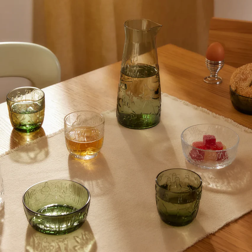 The new glass collection, Mystical Forest, includes embossed tableware made with modern and traditional glassmaking techniques in the world-famous Iittala glass factory in Finland. The collection’s pitchers are mouth-blown, which makes each piece one-of-a-kind. Inspired by the Finn Family Moomintroll novel, the collection invites you to discover the magic of a mystical forest. The embossed glassware collection includes tumblers, bowls, plates and pitchers in two colours.