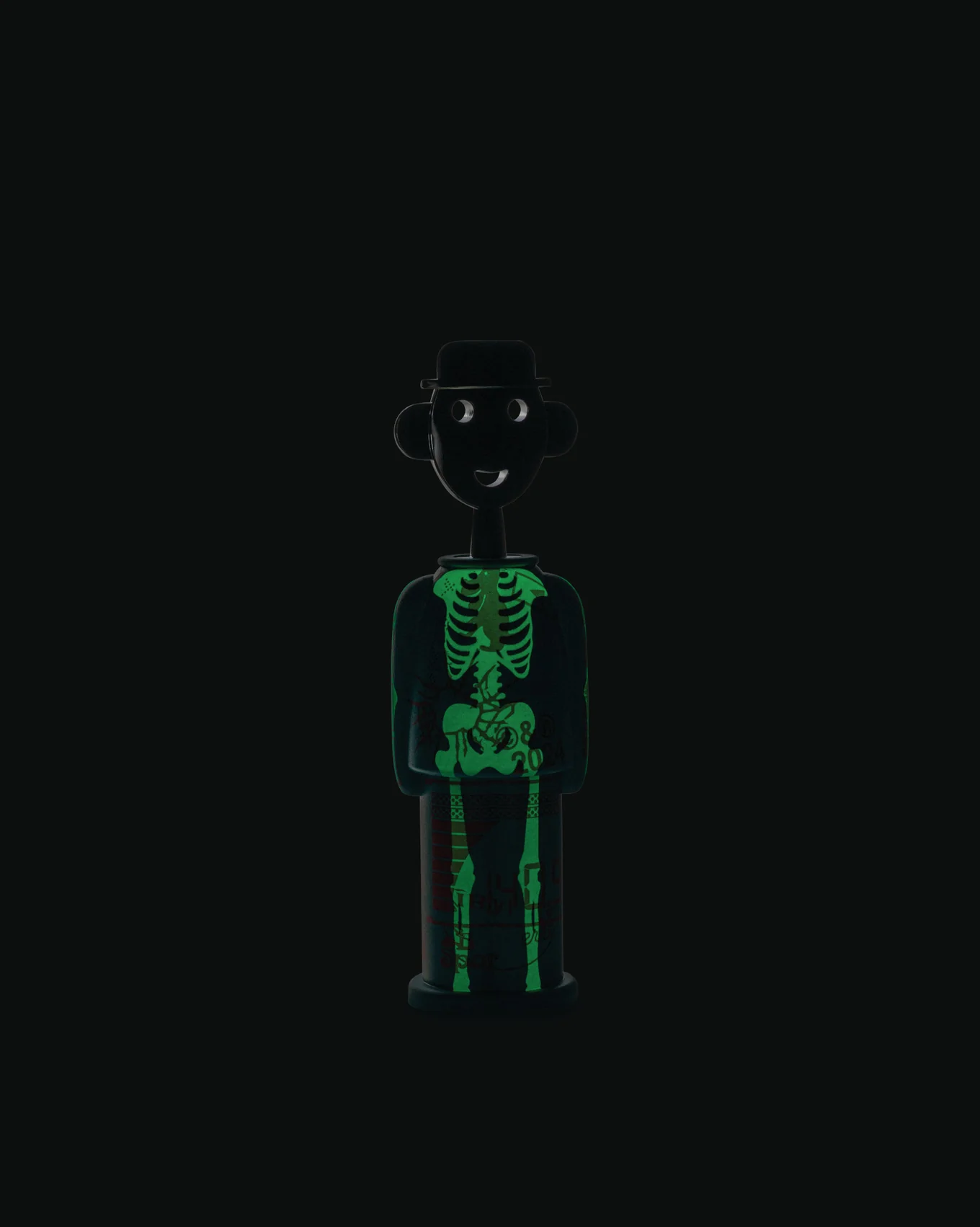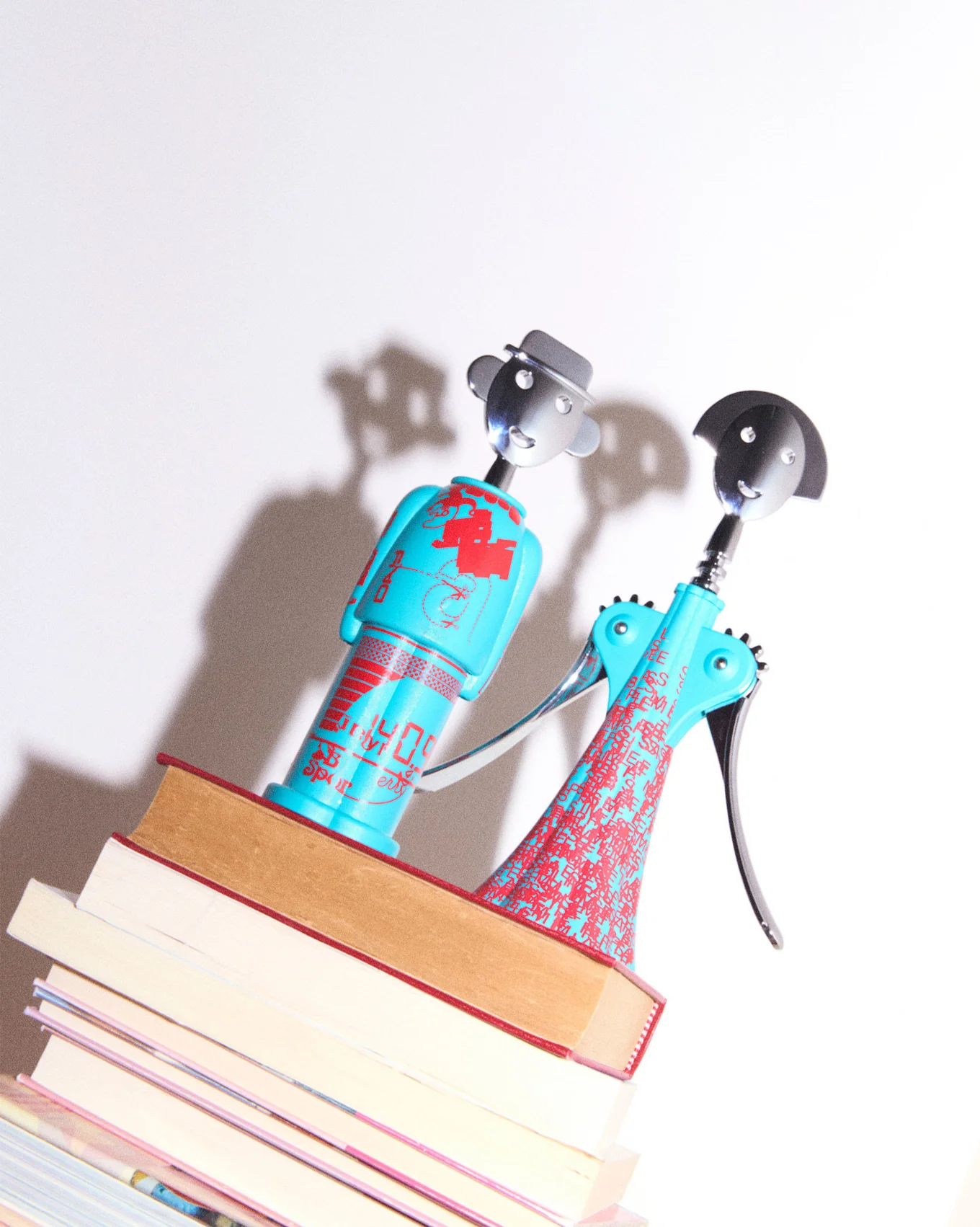 The creative trio from Studio Temp draws from the deep reservoir of street art to create a contemporary and cryptic interpretation of the iconic corkscrew by Alessandro Mendini. The graphic presented is the result of a personal imprint full of eclectic ideas, ranging from street signs to modern data protection techniques. The decoration contains phosphorescent elements that are only visible in the dark. Body made of AlkiPaper®, a patented biocomposite based on paper, other raw materials of natural origin and functional components.