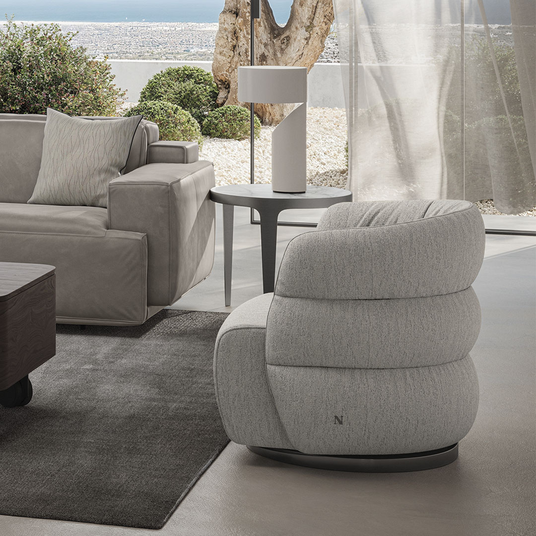 Sharp enveloping shapes and sleek volumes for an oasis of relaxation and comfort. The Couture armchair is equipped with a large circular metal base which support the deep seat and enveloping backrest providing an extremely pleasant lounging experience.