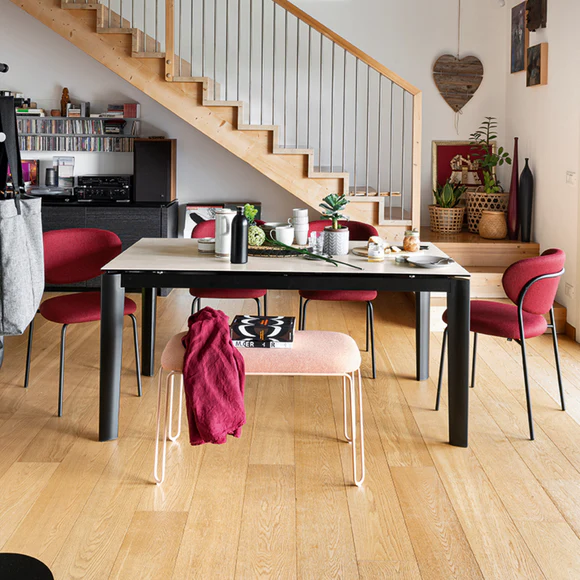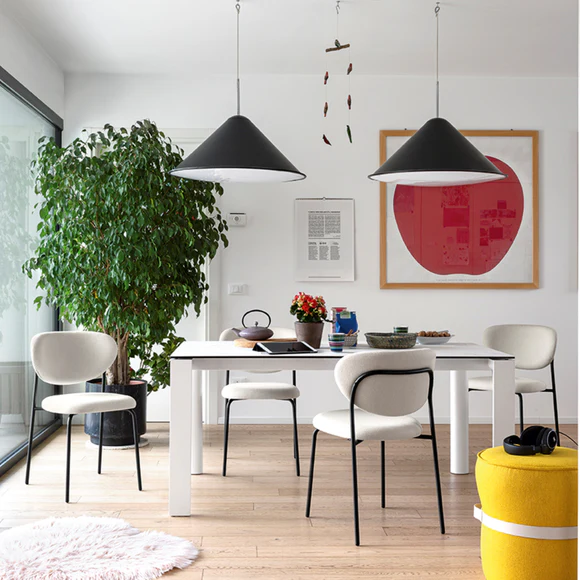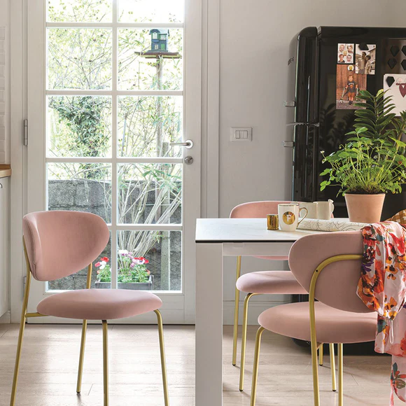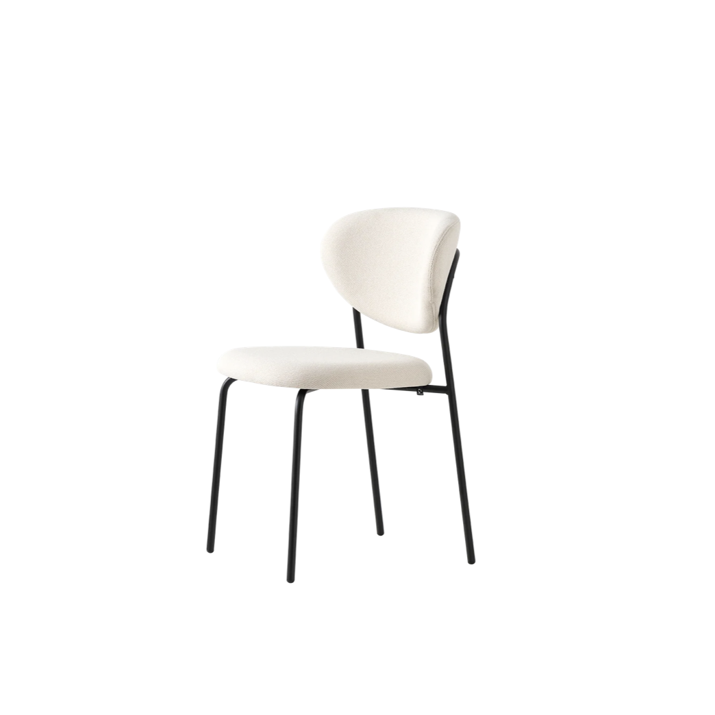 Cozy is simplicity, versatility and lightness itself. Padded comfortable seat and wraparound backrest covered in fabric resting on a coloured metal base.