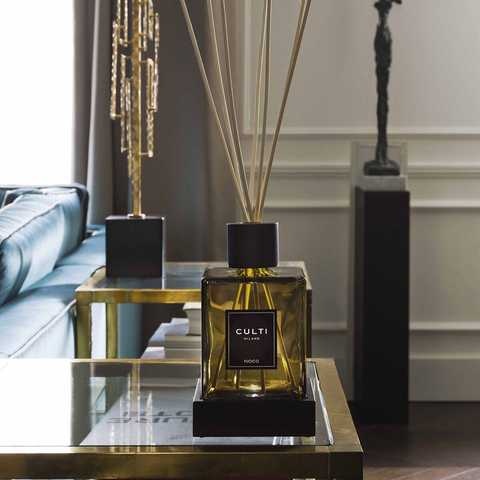 Sculpted, square-shaped bottles in thick glass with Dark Brown maple wood cap. The bold, distinct features of the CULTI DECOR line add a touch of character to any room. Aramara: A sunny day in the countryside, infused with the reassuring aroma of citrus peel. The scent of the fruits is dispersed and remains suspended between a pleasant bitterness and a candied sweetness, just like some of life__ moments.
