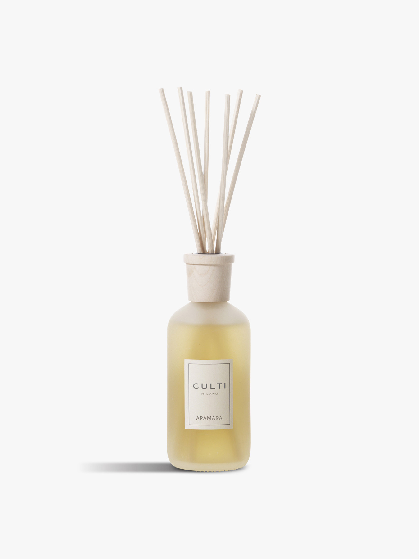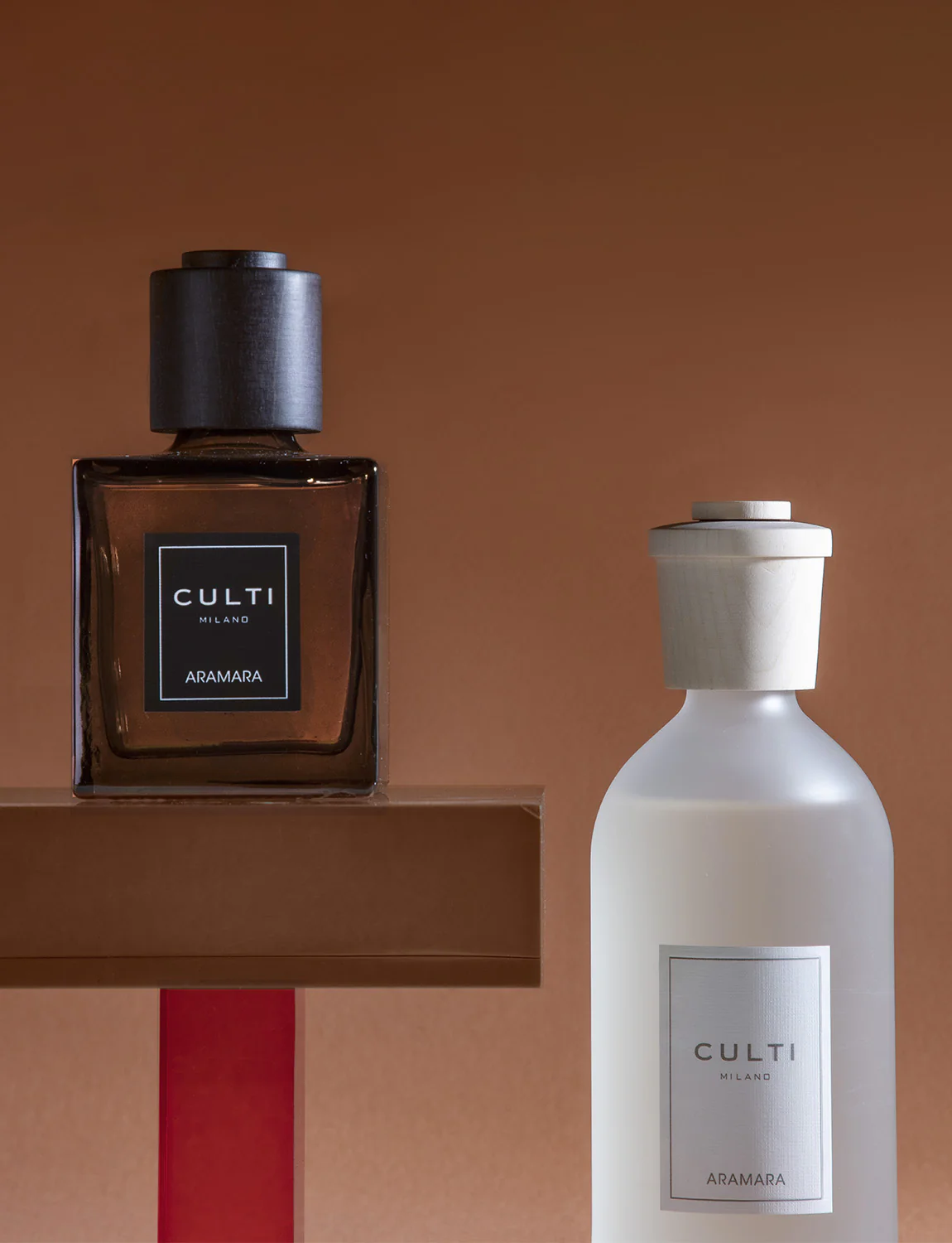 Glass bottles with ivory-coloured labels and cap in natural maple wood. The aesthetic character of the CULTI STILE line evokes purity and elegance. Aramara is the result of an afternoon spent in the kitchen of a Sicilian pastry chef who summoned his skills to reveal the countless secrets of bitter orange.