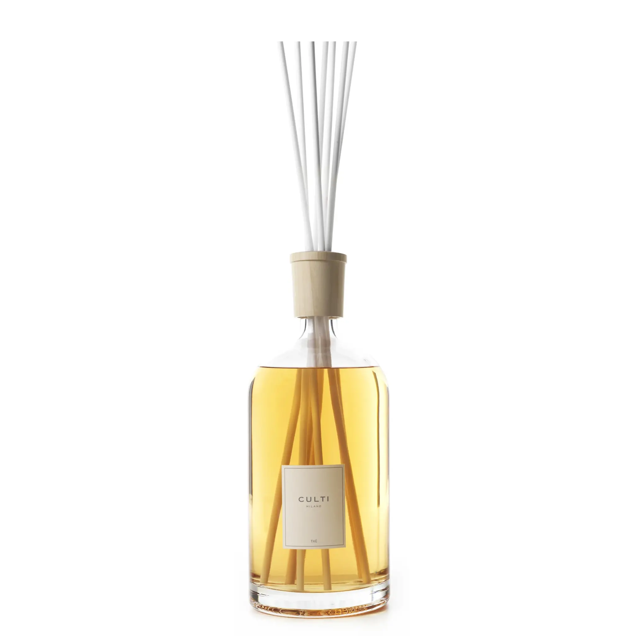 Glass bottles with ivory-coloured labels and cap in natural maple wood. The aesthetic character of the CULTI STILE line evokes purity and elegance. Th__©: Soaking in the meditative warmth of a bath tub filled with Japanese green tea. Vapours rise hypnotically off the water, delicately diffusing and filling the room with the aroma of tea leaves.