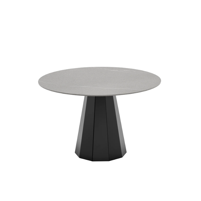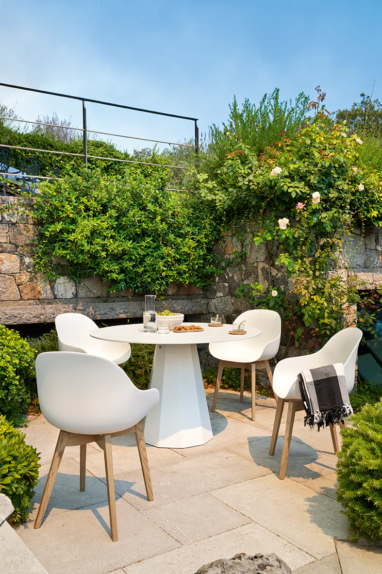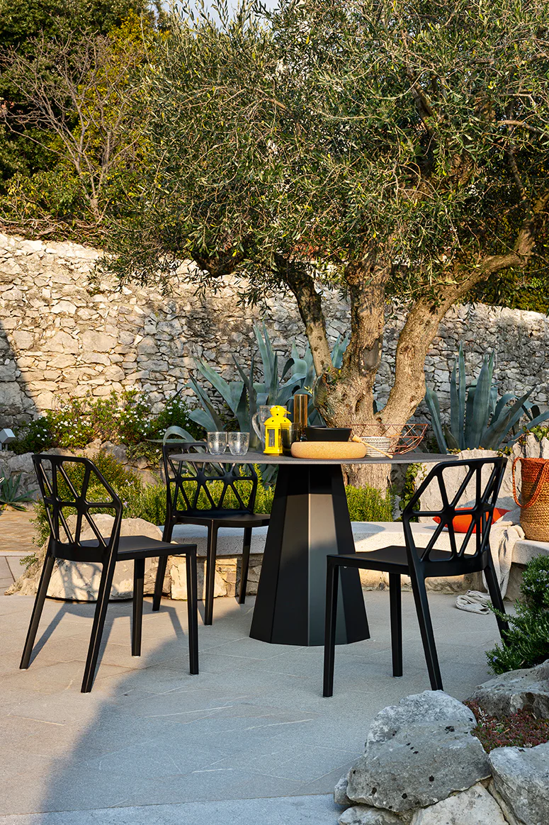 Dix is the embodiment of hospitality. A non-extending table with a base in faceted sheet metal which will catch and reflect the light in your alfresco dining area. With adjustable internal feet, it has been treated and coated for outdoor use. You can choose between an HPL top or a ceramic top enhanced with In-side technology. The latter has a tactile marled finish reminiscent of natural stones to create an unbroken effect between the surface and the edge. All Dix surfaces are easy to clean and do not require maintenance despite the passage of time. The ceramic surface has been specially designed to prevent mould and mildew from growing.