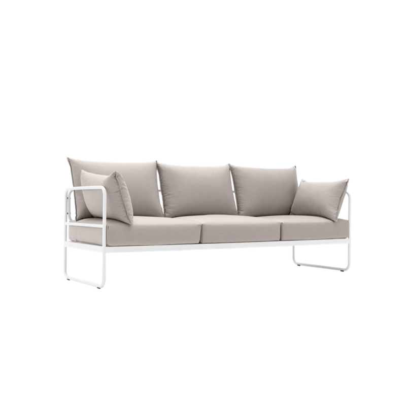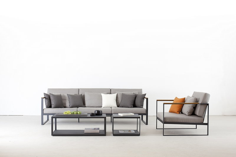 With a tubular-metal frame that has been treated and coated for outdoor use, the sturdy EASY sofas are fitted with removable covers, adding a splash of colour and providing supreme comfort. The seat cushions rest on a slatted base reinforced with polypropylene. Easy has been upholstered in polyurethane foam protected by a waterproof PVC lining and covered in water-repellent Sunbrella® fabric. The fabric gives special protection against UV sunlight and is fade-resistant, as well as having mouldproof and stainproof properties. You can enhance comfort levels by adding the Sunny scatter cushions (with removable covers) and the Rider footstools.