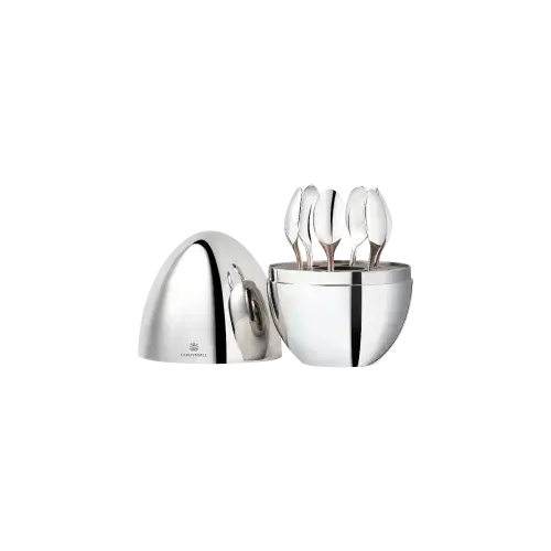 A decorative silver-plated egg-shaped case with a Walnut Wood interior disk for storage.