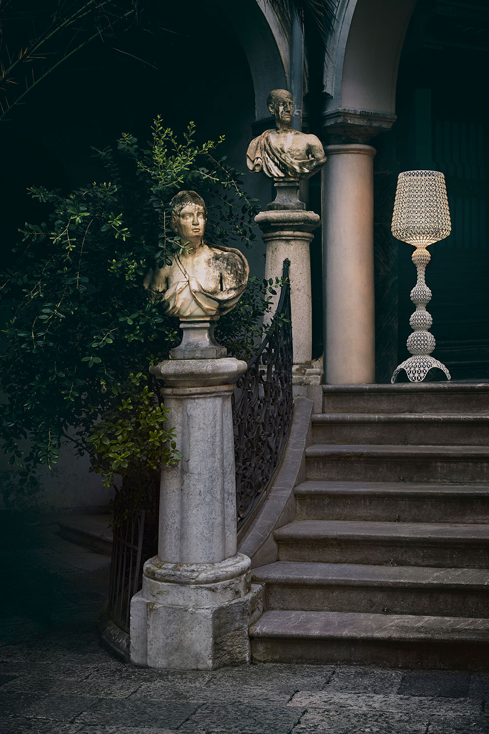 The Kabuki floor lamp is injection moulded. The technology used makes it possible to create a woven structure similar to lace with a unique perforated surface through which the light is diffused. Available in indoor and outdoor versions.
