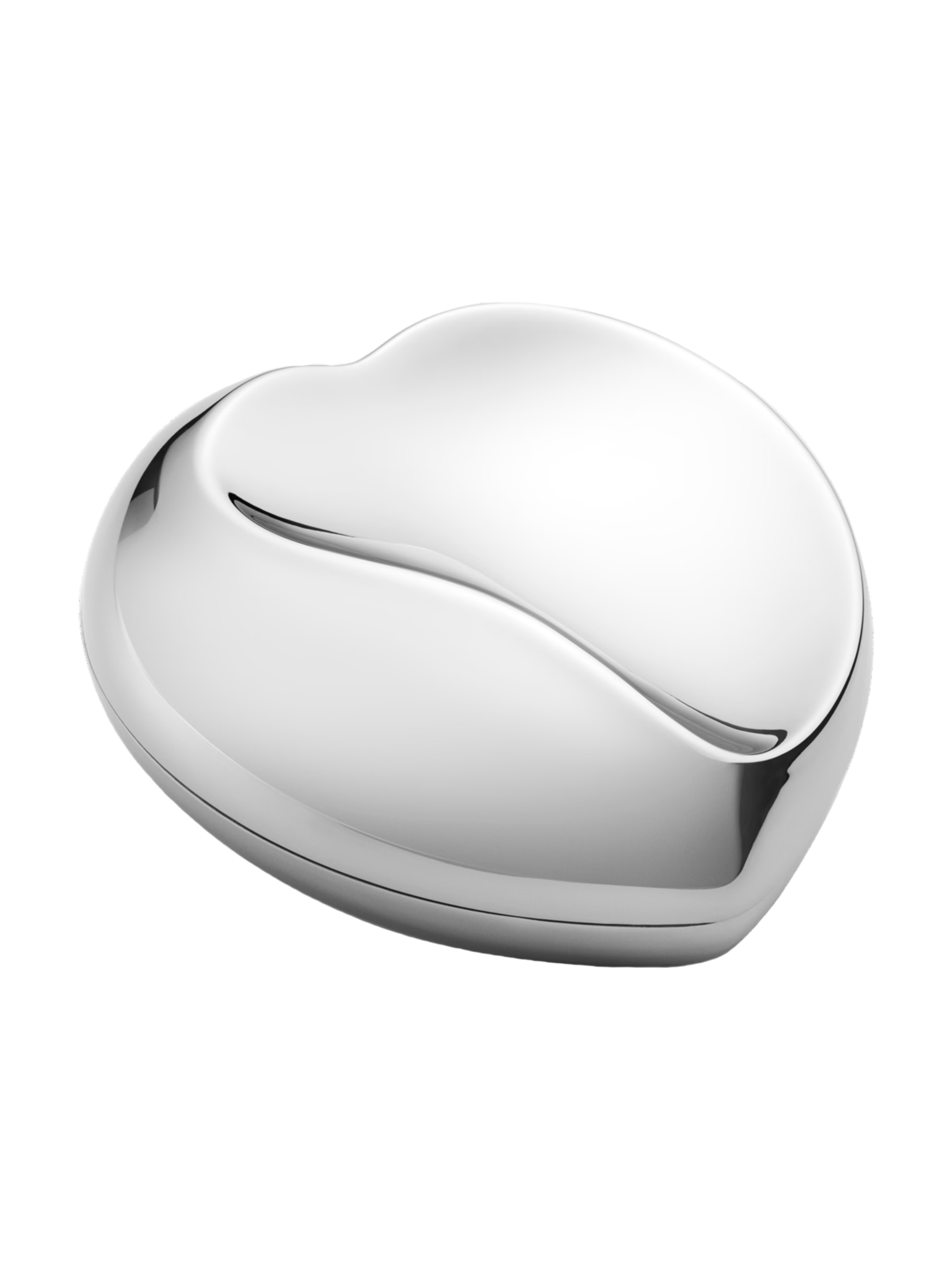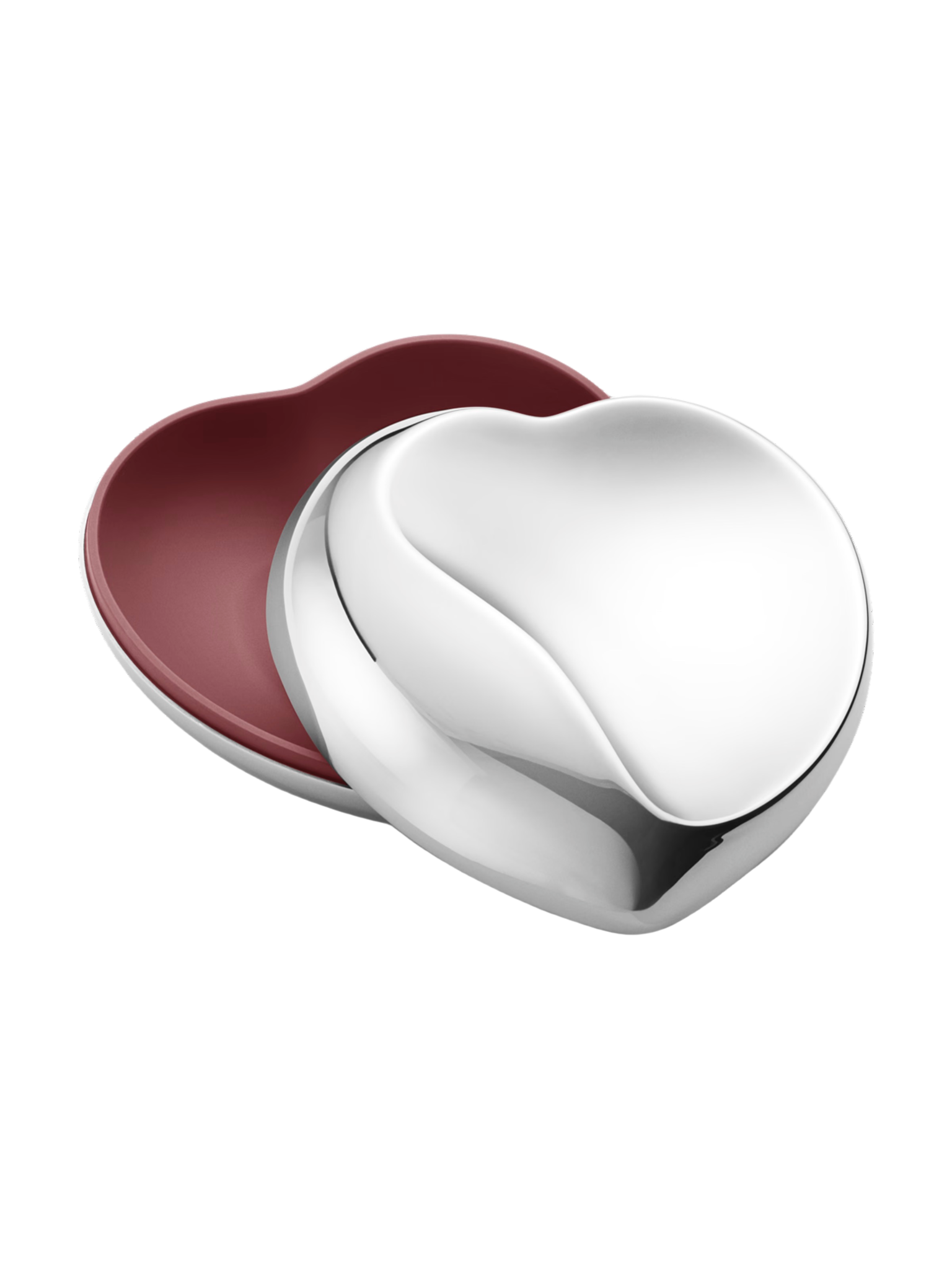 Crafted in mirror-polished stainless steel, this charming heart-shaped box makes an ideal gift for Mother's Day and birthdays. The piece is perfect for storing small and medium-sized pieces of jewellery. Its elegantly undulated surface allows for placing bracelets, bangles and other jewellery pieces on the lid when closed. Inside, the box is coated with a layer of burgundy-coloured silicone which helps prevent scratches. The item is not dishwasher safe and is not meant for storing food.