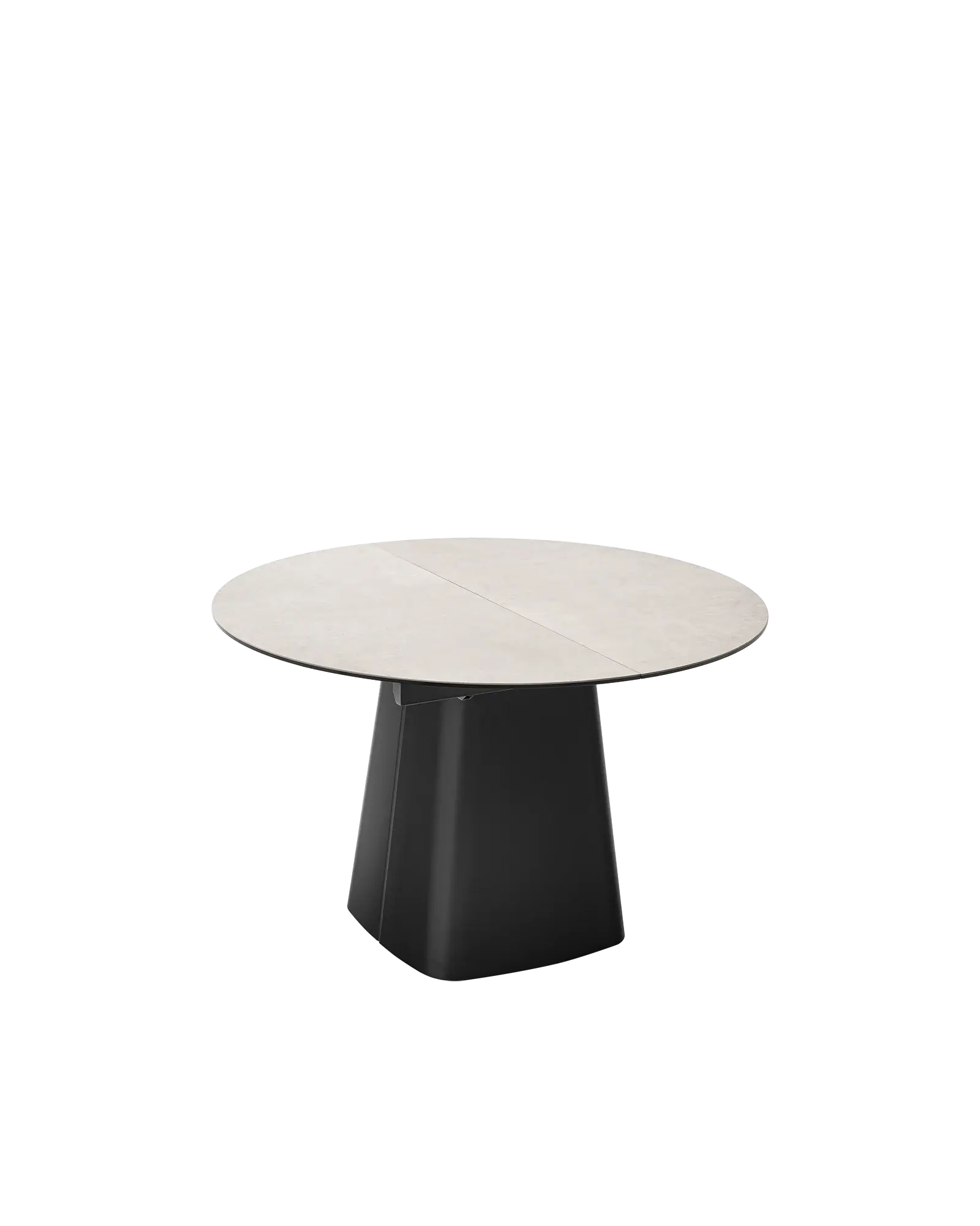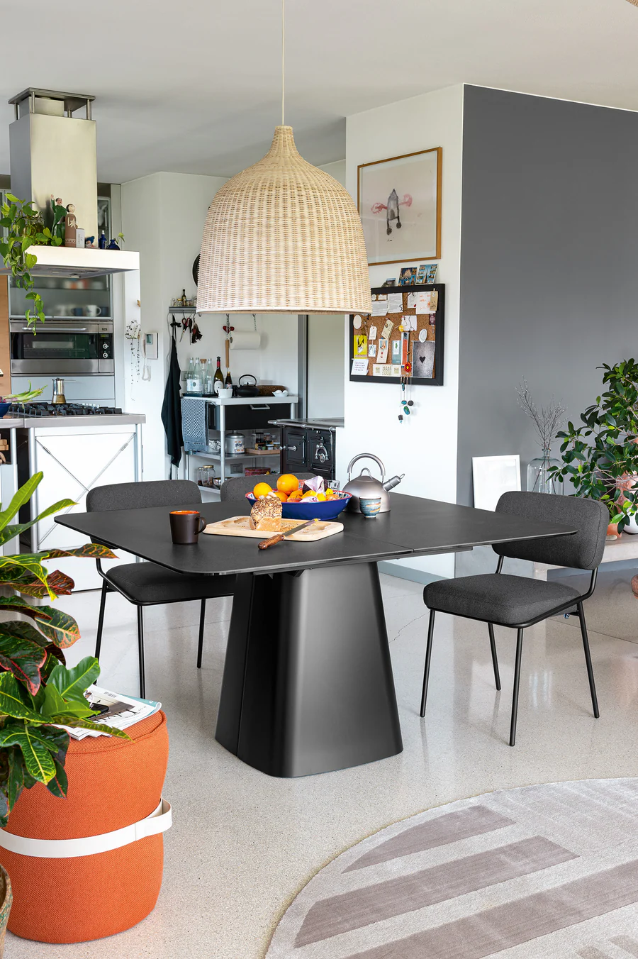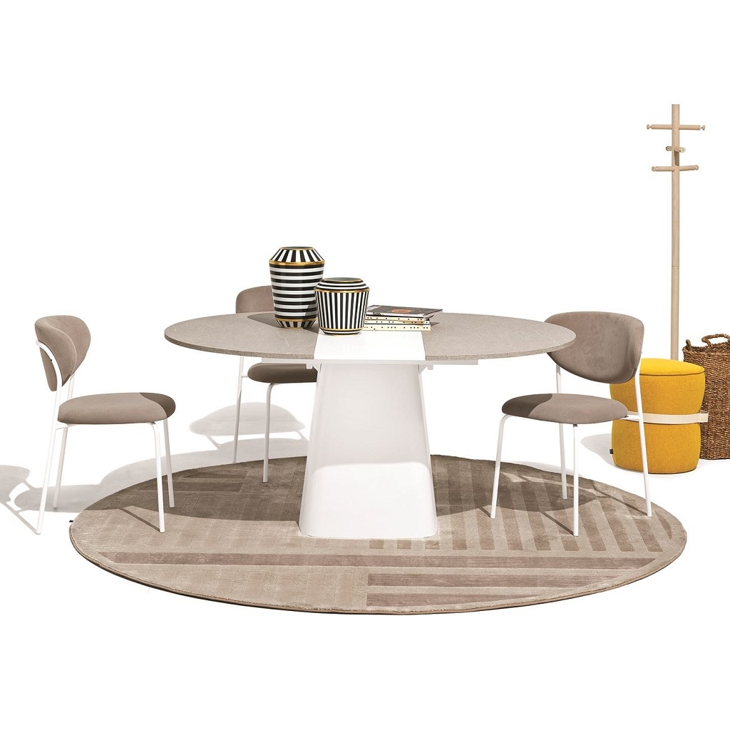 You will see your kitchen and living room in a new light with Hey Gio! It features an elegant cone-shaped support column in coated sheet metal upon which the extendable table top rests. It has a central butterfly extension leaf that matches the base, as well as practical round table tops in melamine or ceramic.