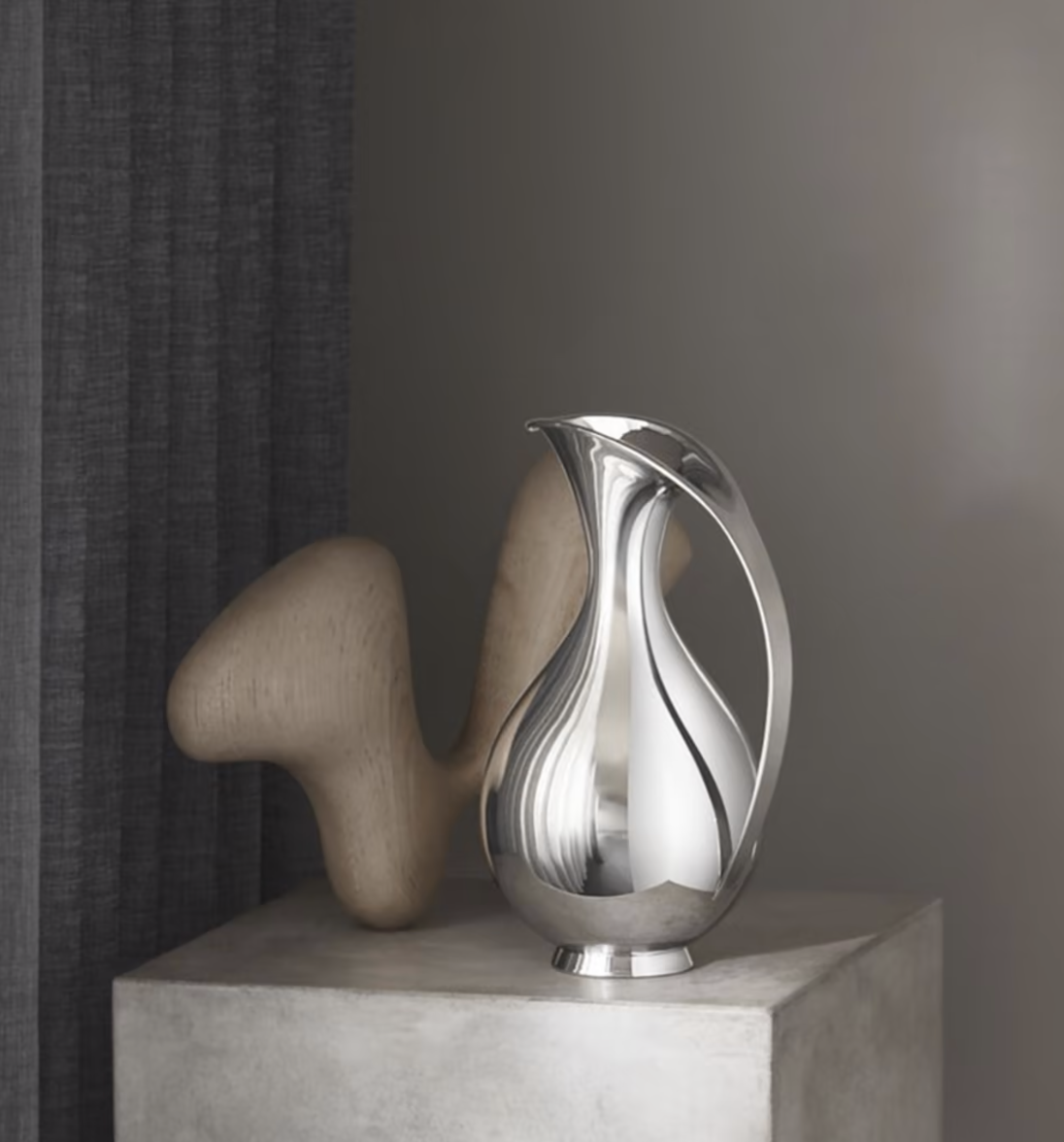 This striking pitcher is now exclusively in mirror-polish stainless steel, updated from its original sterling silver. The 1920's marked the beginning of the design collaboration between Georg Jensen and architect Kay Fisker on his beautiful sterling silver pitchers.
