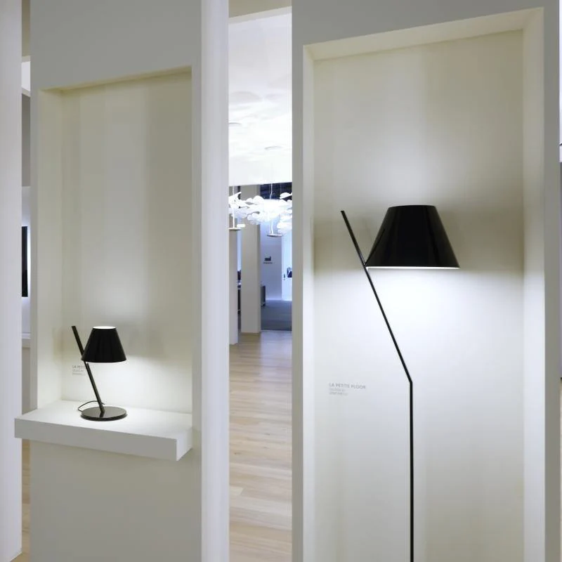An archetypal lampshade balancing on a slanted rod creates a balanced and stylish geometric composition that is mesmerising despite its simplicity. The lampshade is a light plastic volume closed by two diffusers that produce a delightful soft direct and indirect light. The joint supports the lampshade on a minimalist resting point, connecting it to the aluminum rod.