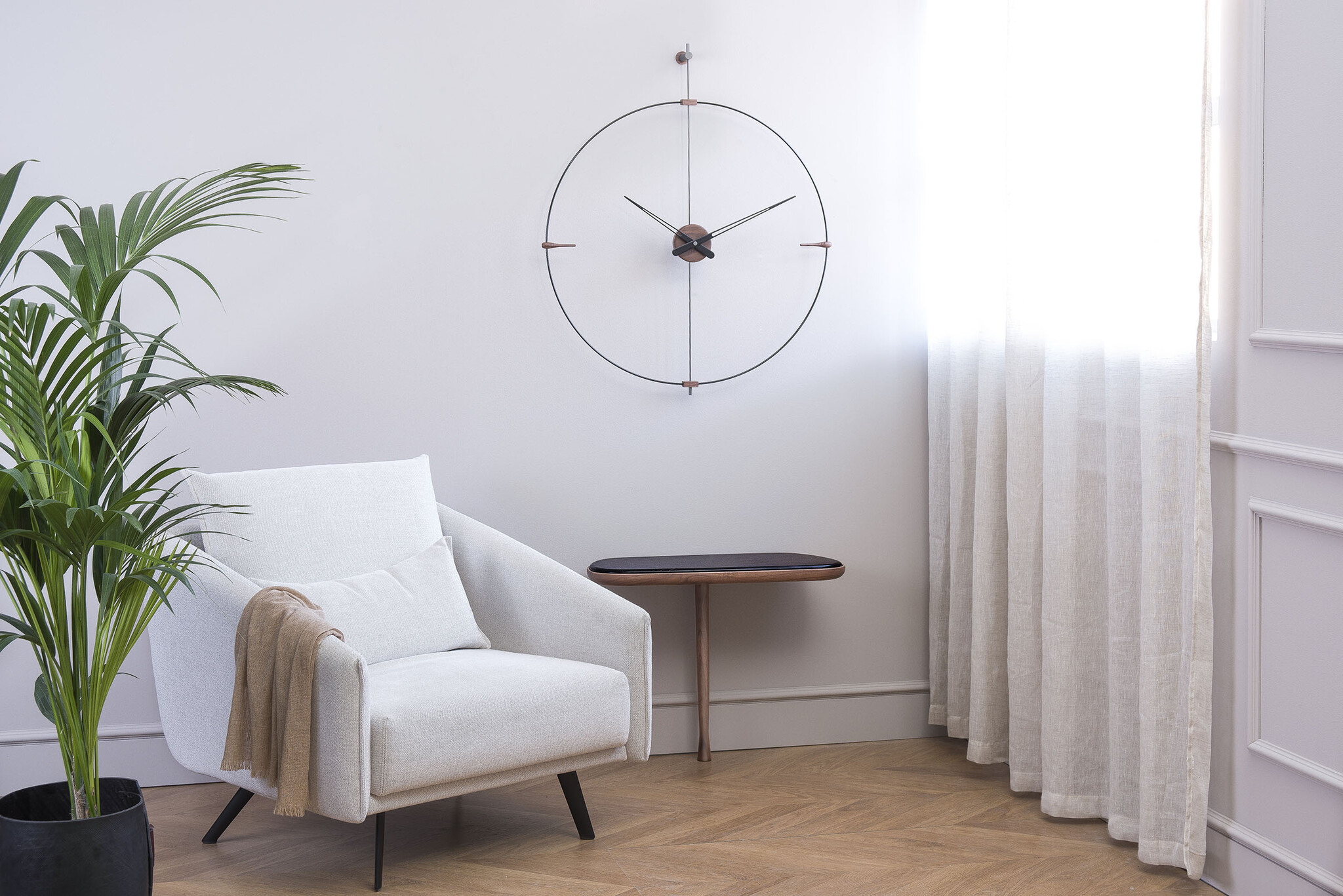 The slim outline and the traditional turning of the time indications give the whole a sublime accent. The minimalist round clock ' Mini Bilbao ' consists of a large black fiberglass ring with a diameter of 77 cm and clock hands made of black lacquered walnut. The mechanism of the clock, housed in a walnut case, consists of a German UTS quartz mechanism. With its slim, feather-light frame, Andres Martinez's Mini-Bilbao is considered a comeback of the essence of a clock. Nomon is the undisputed leader in high-quality clock design.