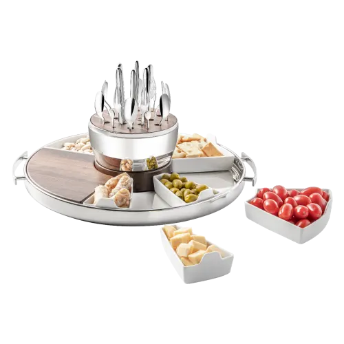 The two-handle stainless steel tray consists of a partial, removable walnut board and bowl.