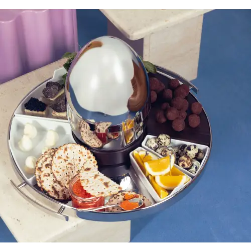 The rest of the tray is composed of six porcelain compartments that double as removable serving dishes. Christofle shakes up the art of entertaining with a new art of sharing concept.