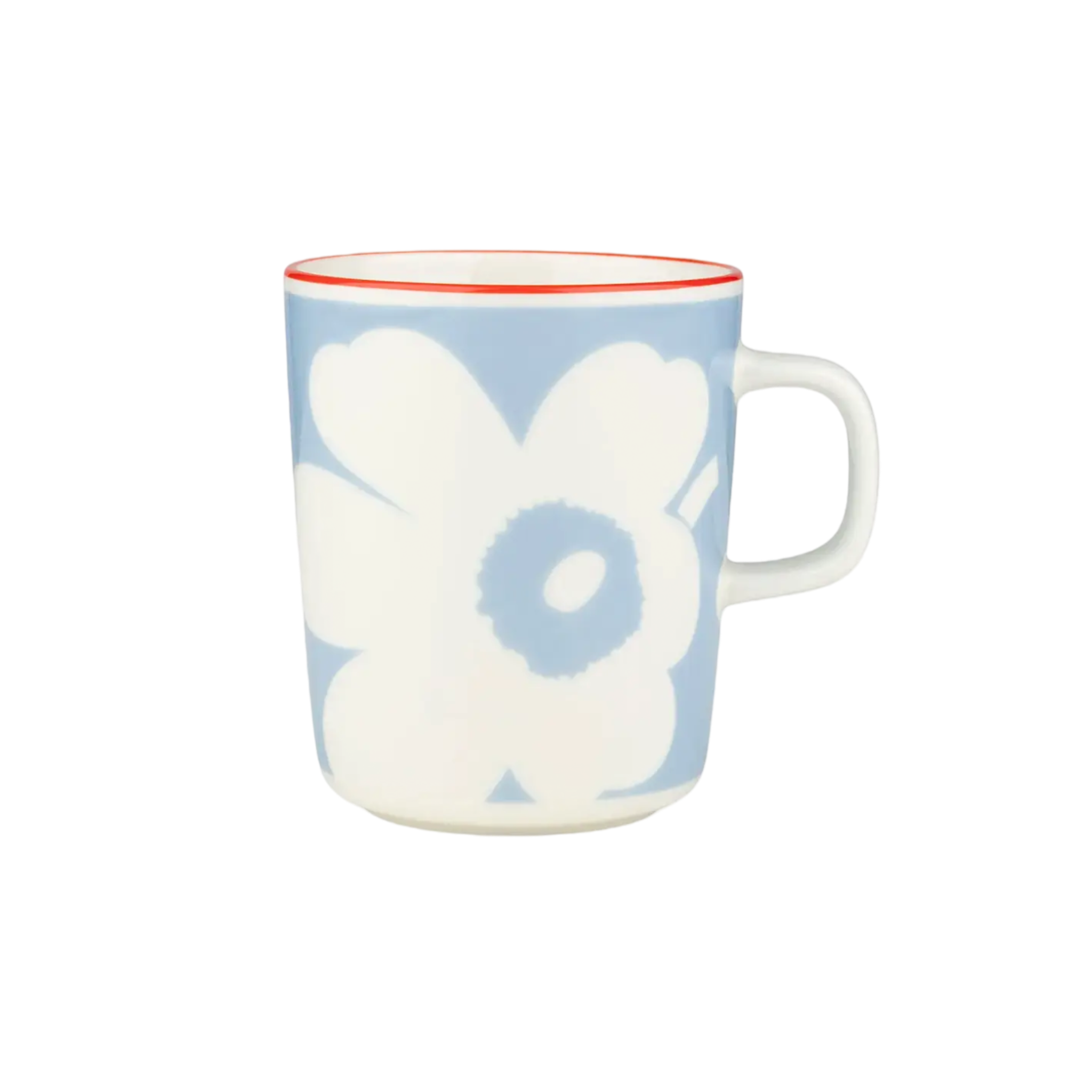 The Oiva mug features the Juhla Unikko pattern and an orange, hand painted rim. The mug is dishwasher, oven, microwave, and freezer safe.