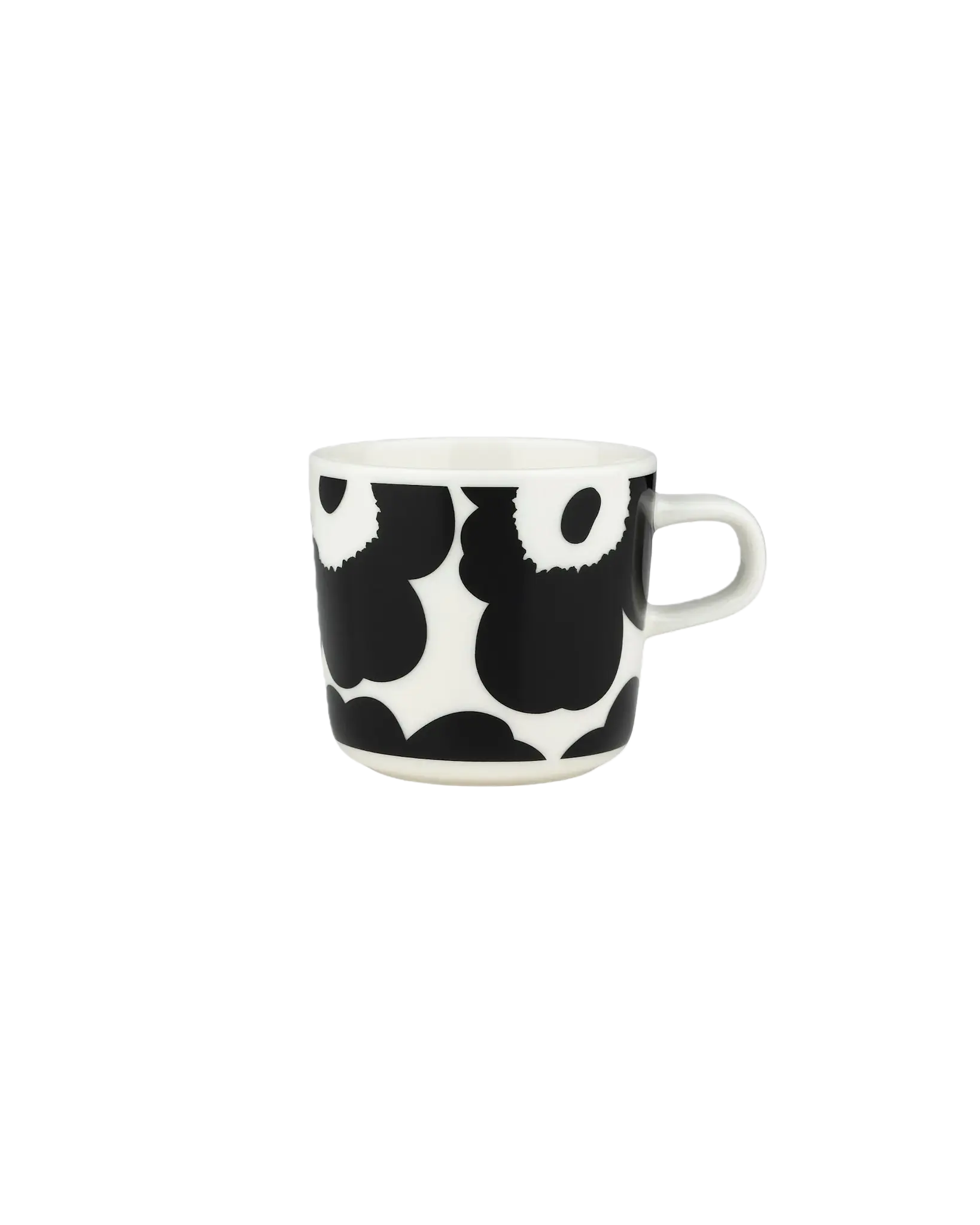 The Oiva mug with Unikko pattern is made of white stoneware that is dishwasher, oven, microwave and freezer proof.