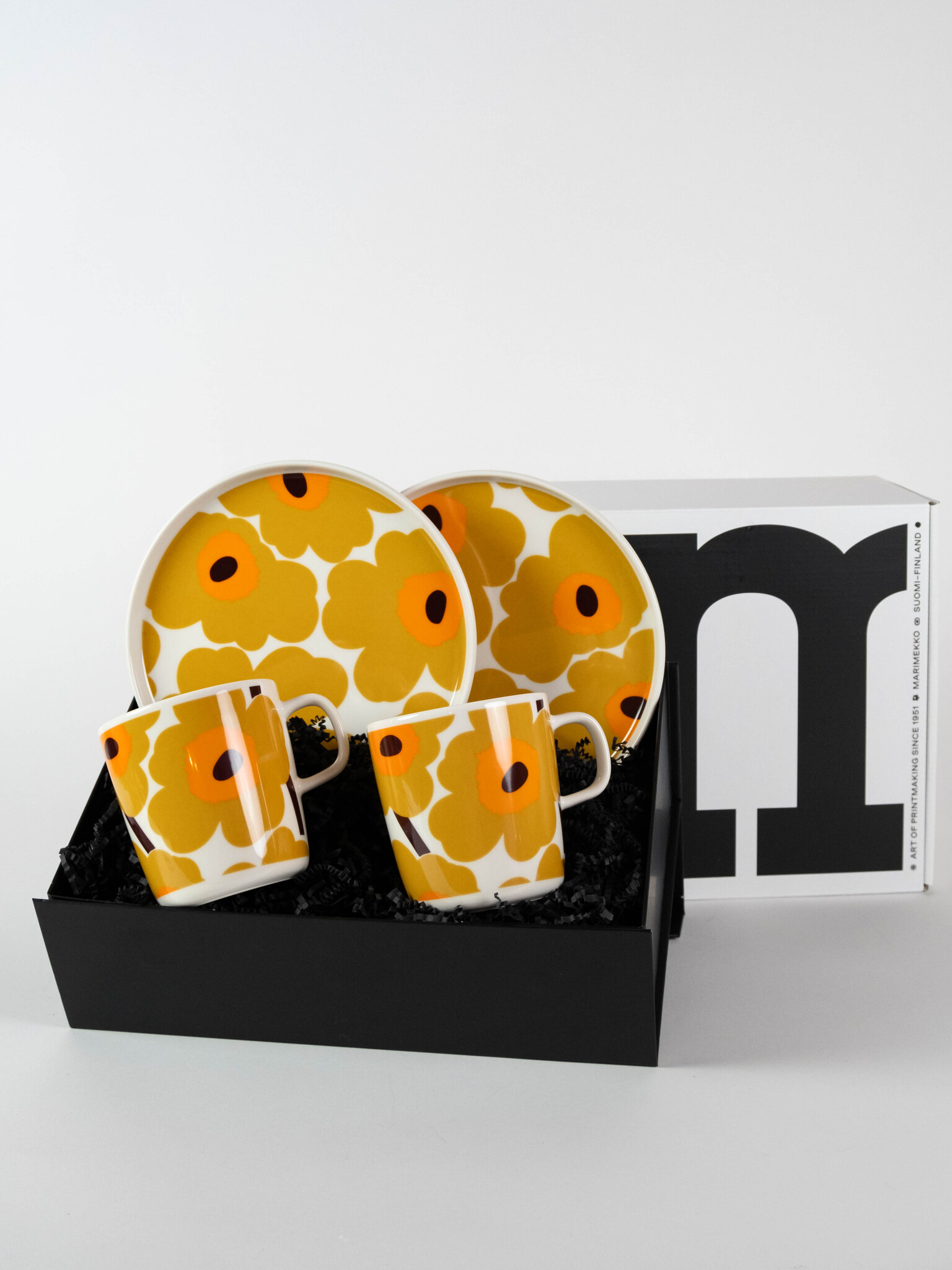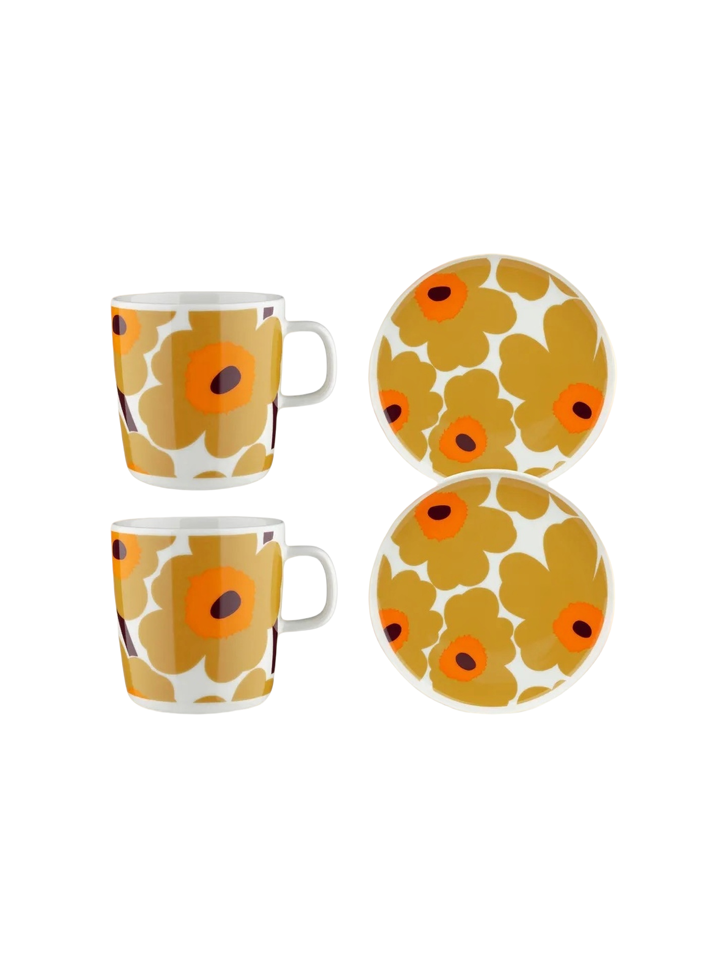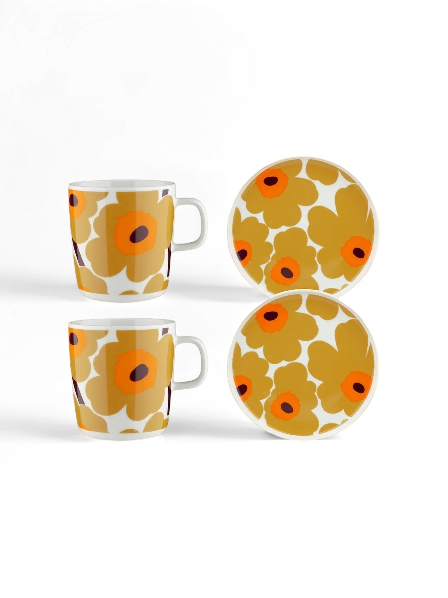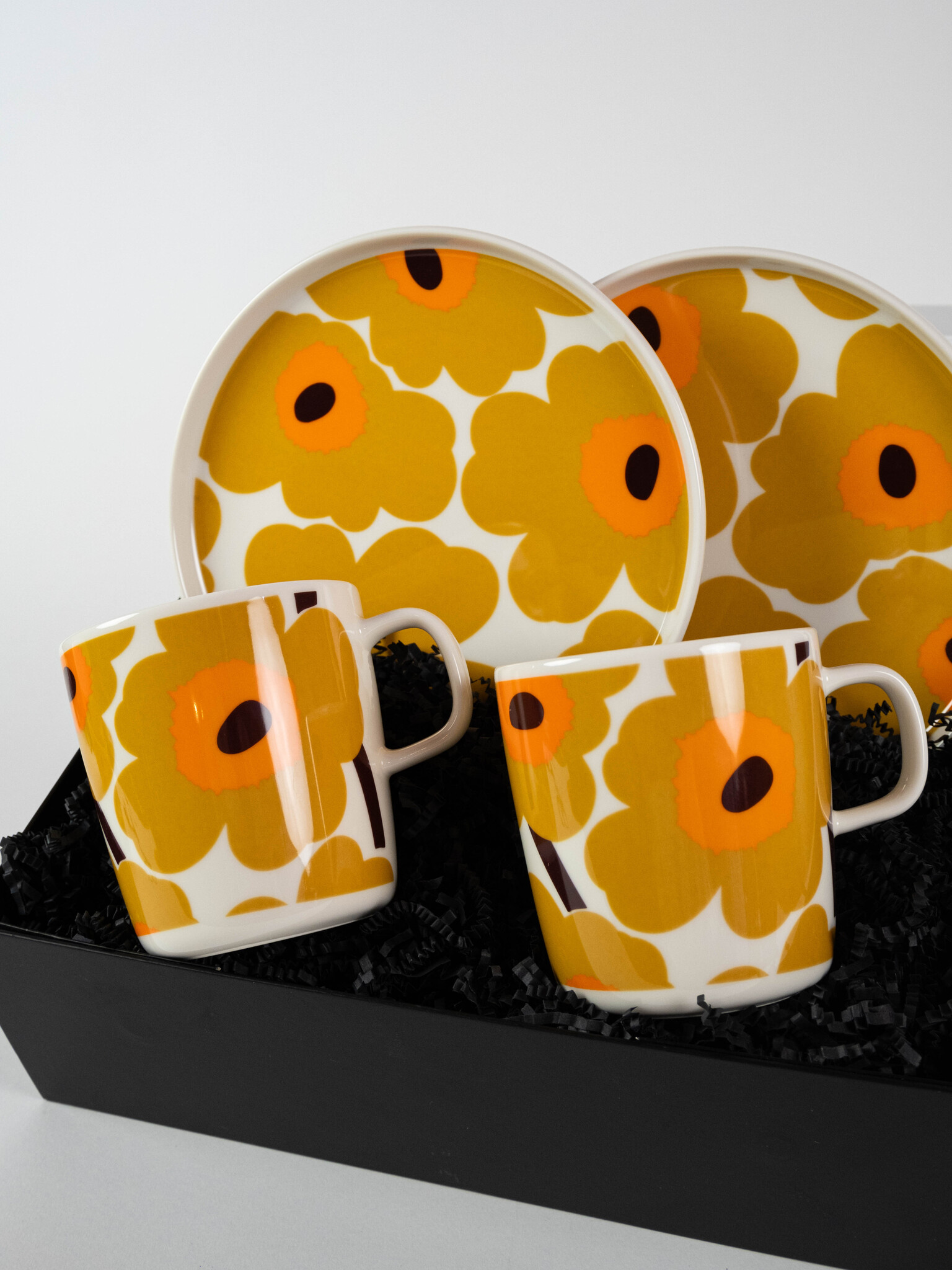 The Unikko pattern Oiva breakfast set includes two 4 dl mugs and two 20 cm plates. The set is dishwasher, oven, microwave, and freezer safe.