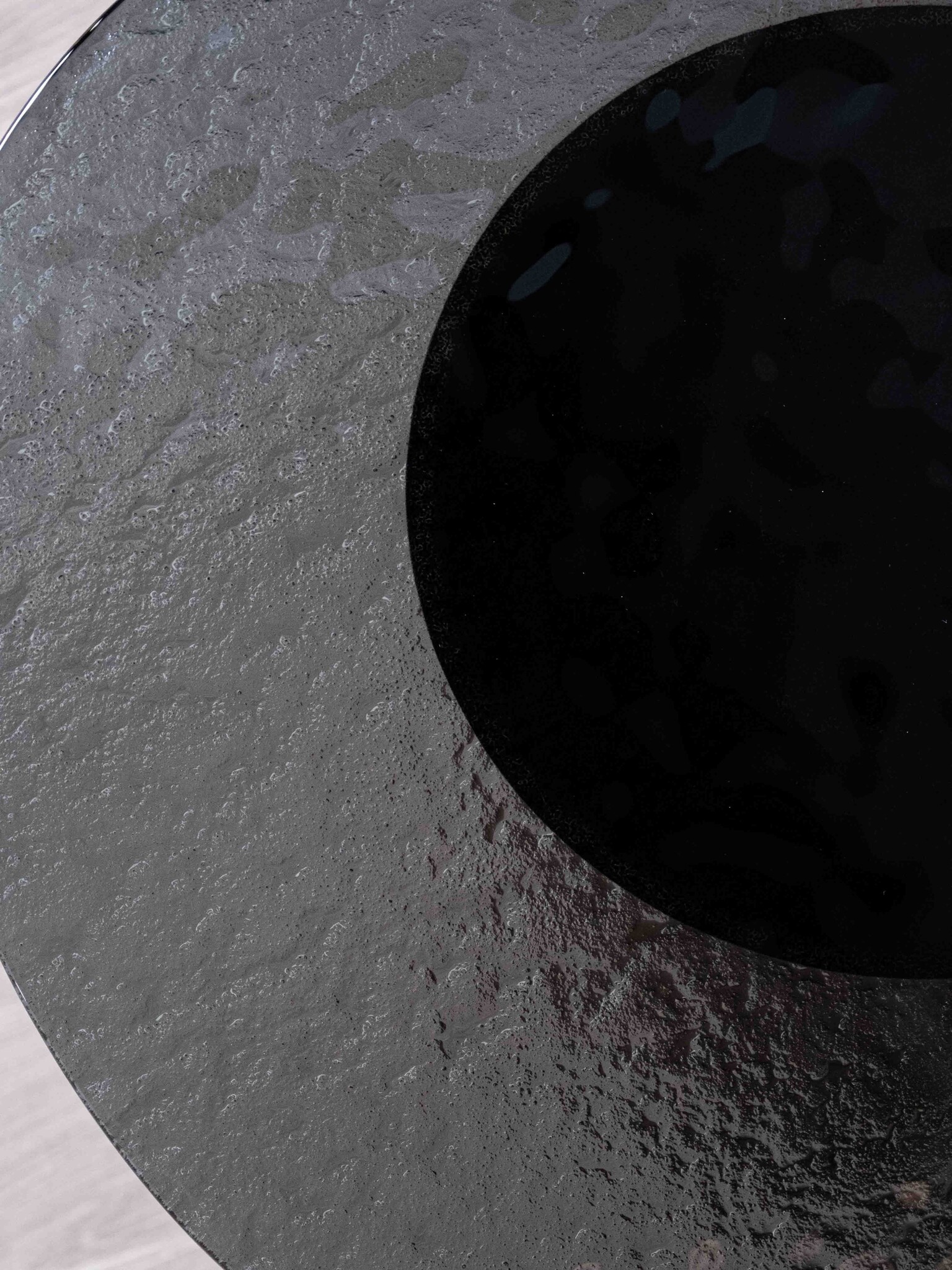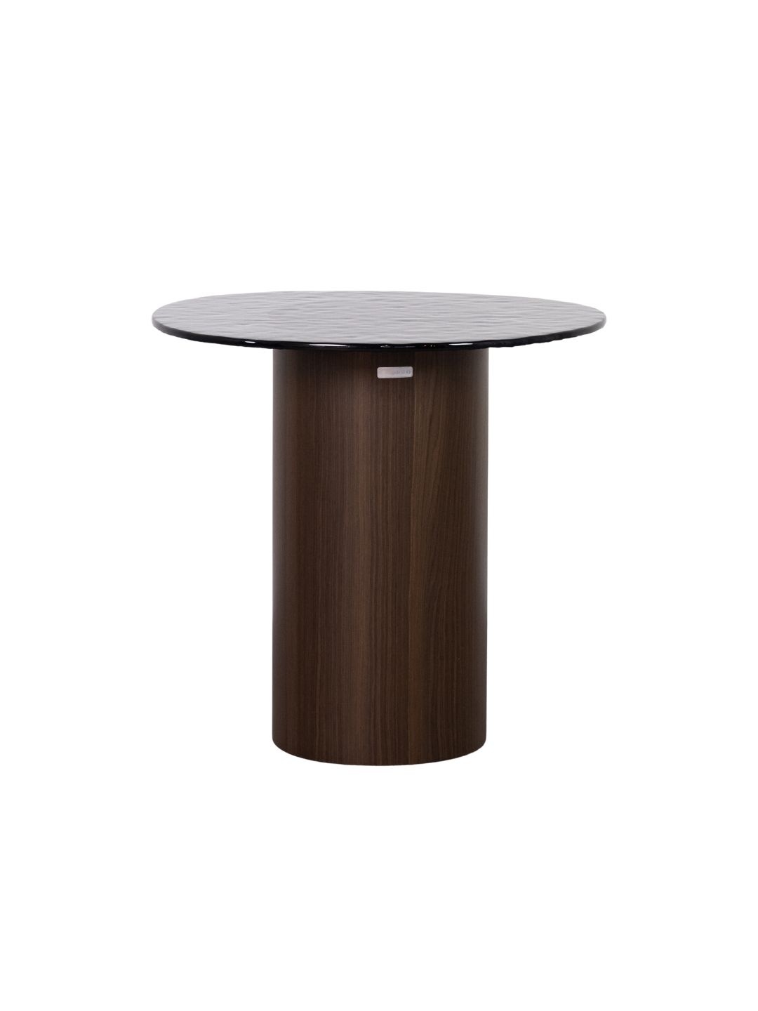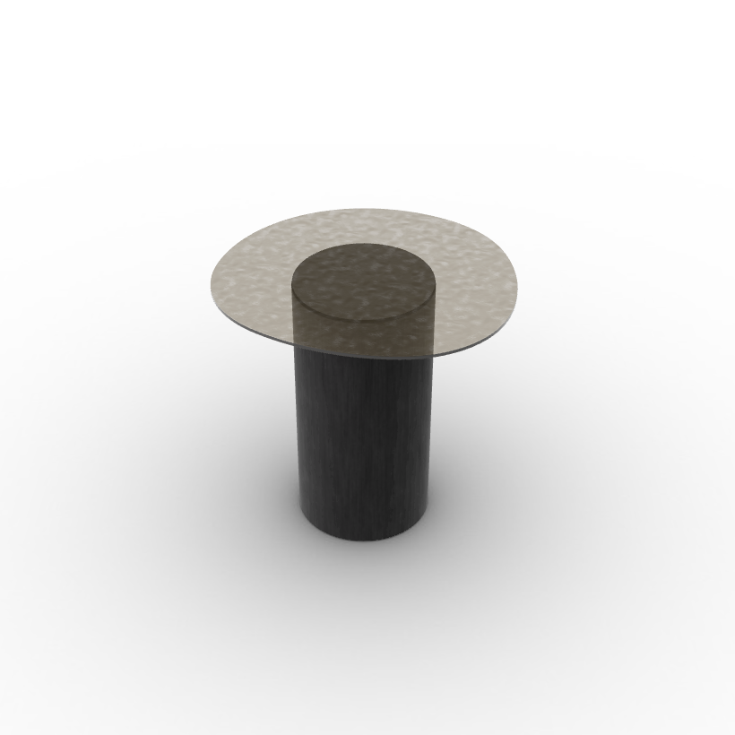 The bush-hammered glass top resembles the vibrant hues and beauty of glass-paste gems. Its sleek cylindrical wooden base adds a touch of uniqueness with a slight asymmetry, creating the illusion that the top hovers gracefully above it.