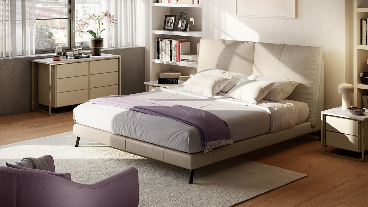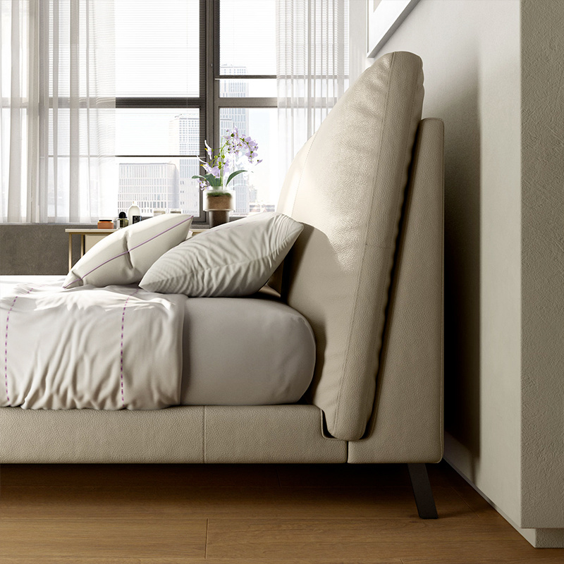 New York is a bed with clean and rigorous lines, with defined volumes and geometric shapes - recalling the unmistakable skyline of the __ig apple_. A mix of contemporary design and comfort, in the best Natuzzi tradition, which finds its perfect synthesis in the two large, soft headboard cushions, a real invitation to relax. A New York bed also in style, with an open base that makes cleaning easier and faster. The double net is replaced by a perforated wooden panel - made of plywood and fir. Available in leather or fabric, with metallic legs in matte black finishing.
