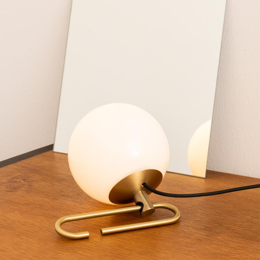 nh1217 is a simple, versatile, practical appliance that can be laid or suspended. A white blown glass sphere slides along a brushed brass ring, which allows it to take different positions and to freely adjust and direct the diffuser. The frame becomes a support, a hook to hang the appliance to the wall, or a handle promoting an interaction with light. nh1217 continues research on the dynamic interaction of experience, details, materials, form, and light that Neri&Hu are pursuing with Artemide. The selected materials represent a perfect combination of tradition and innovation, as well as the expression of responsible and sustainable design, also conveyed by the use of an in-box low-consumption retrofit LED source and by the eco-friendly cardboard packaging