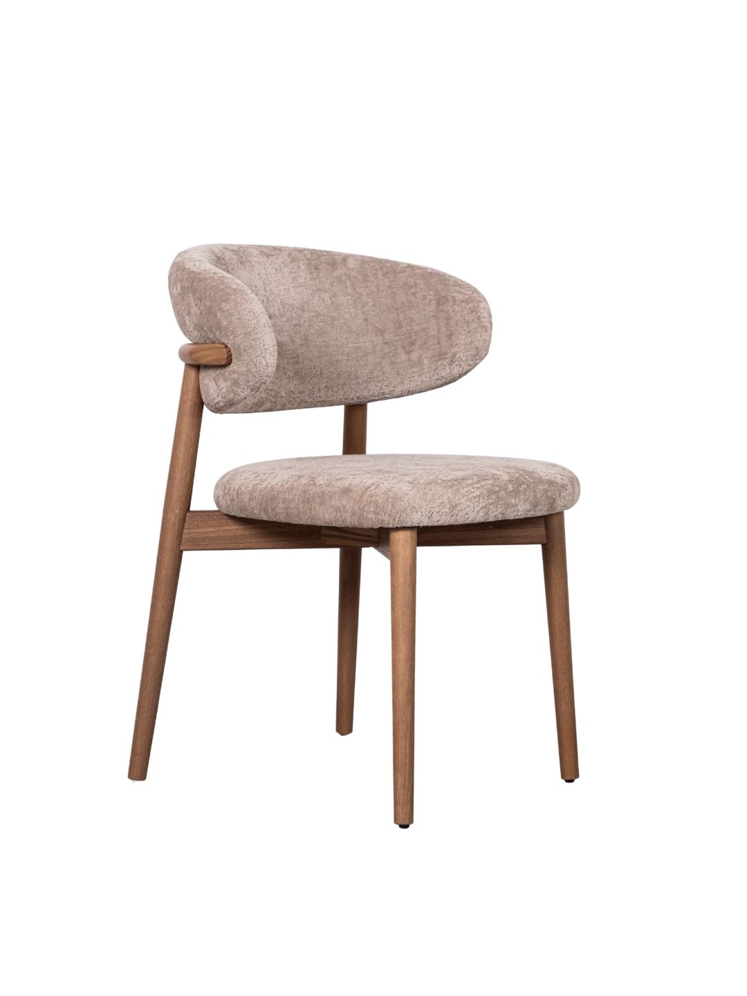 OLEANDRO is a padded chair featuring a sturdy wooden base designed for sheer comfort. The chair's seat and backrest are generously padded, and it offers a wide selection of upholstery choices. An elegant detail on this model is the expertly crafted flattened tip at the end of the wooden backrest frame.